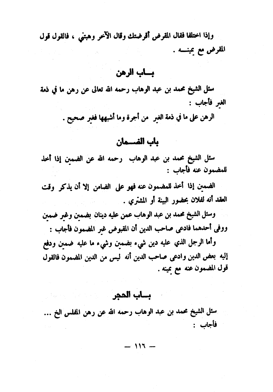 سئل الشيخ محمد بن عبد الوهاب، رحمه الله تعالى: عن رهن ما في ذمة الغير؟