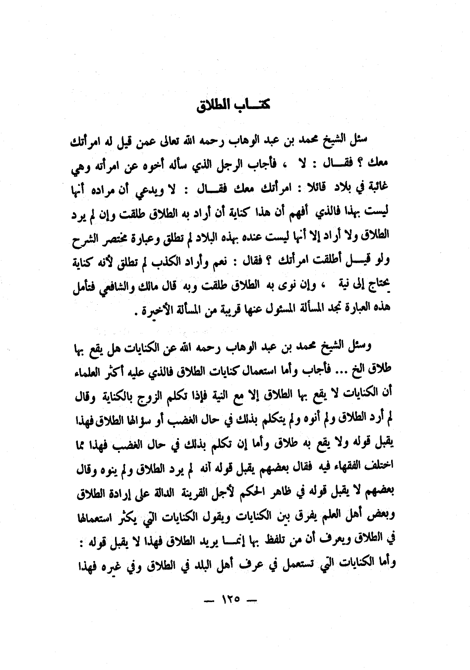 وسئل الشيخ محمد بن عبد الوهاب، رحمه الله: عن الكنايات، هل يقع بها طلاق ... إلخ؟