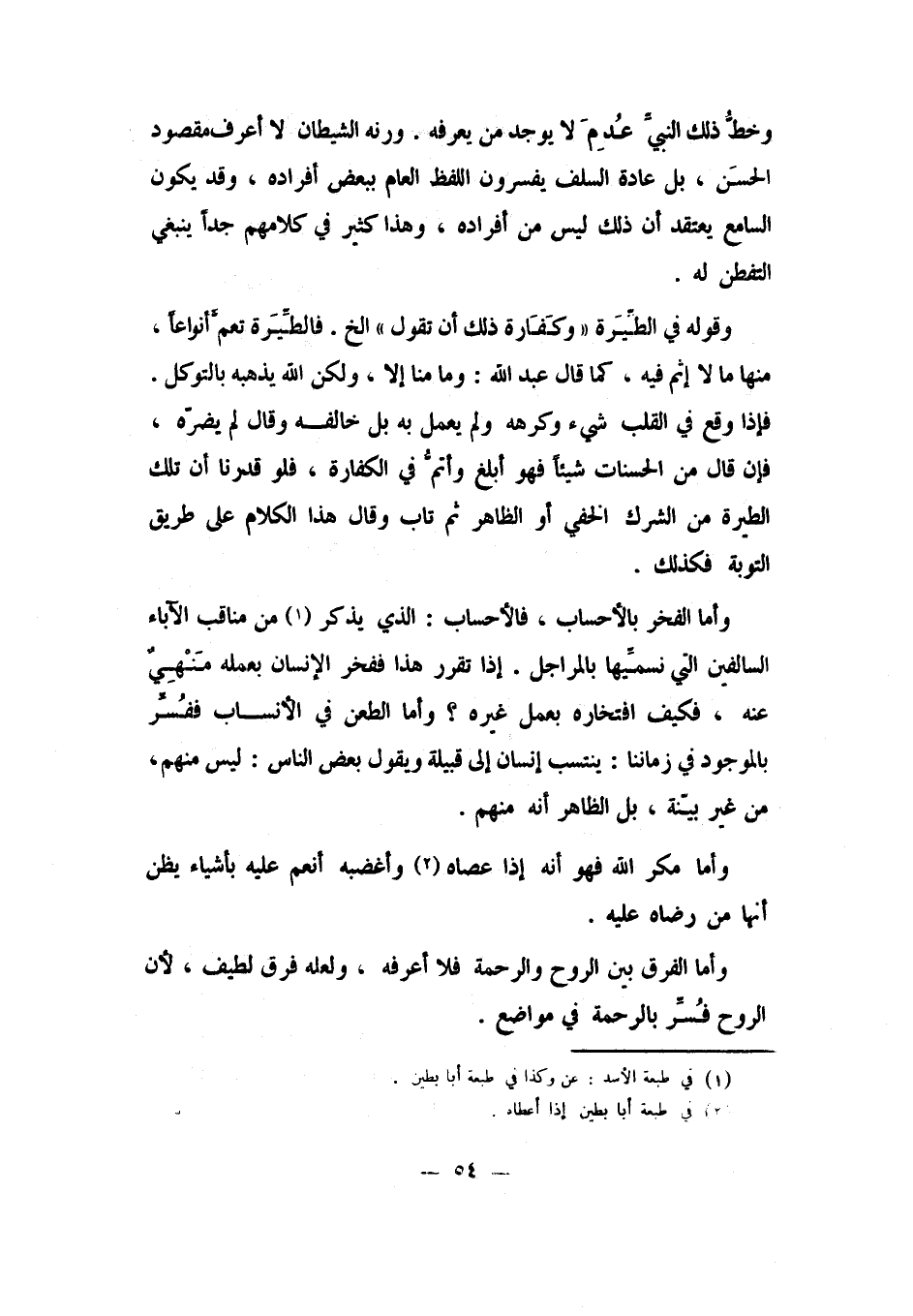 ورنة الشيطان، لا أعرف مقصود الحسن؛ بل عادة السلف يفسرون اللفظ العام ببعض أفراده، وقد يكون السامع يعتقد أن ذلك ليس من أفراده، وهذا كثير في كلامهم جدًا ينبغي التفطن له. وقوله في الطيرة:" وكفارة ذلك أن تقول ... إلخ"، فالطيرة تعم أنواعًا، منها ما لا إثم فيه، كما قال عبد الله: " وما منا إلا، ولكن الله يذهبه بالتوكل". فإذا وقع في القلب شيء وكرهه، ولم يعمل به بل خالفه، وقال، لم يضره، فإن قال من الحسنات شيئًا، فهو أبلغ وأتم في الكفارة. فلو قدرنا أن تلك الطيرة من الشرك الخفي أو الظاهر، ثم تاب وقال هذا الكلام على طريق التوبة، فكذلك.