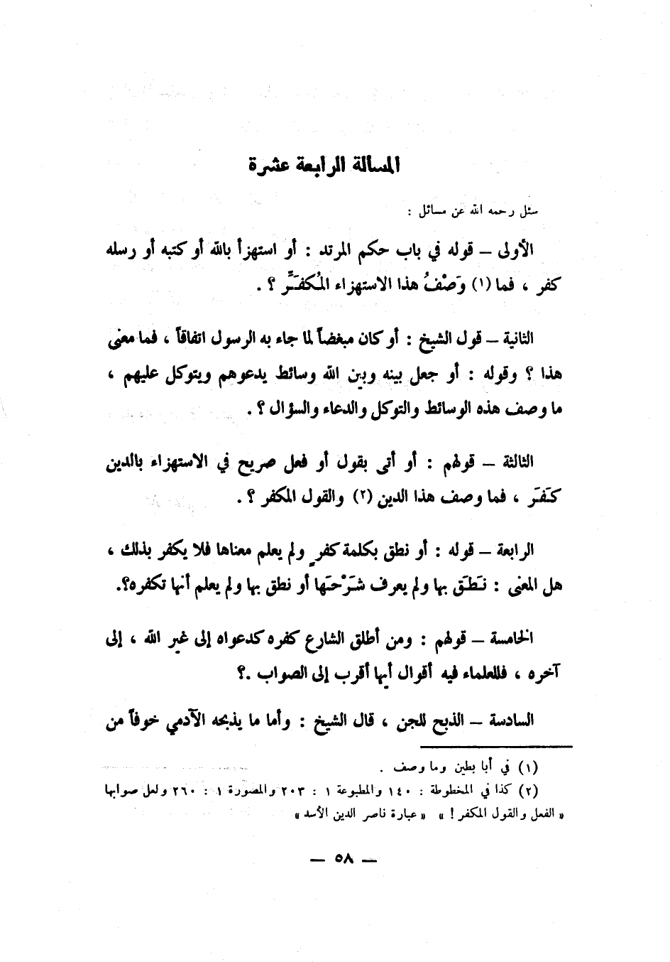 كتاب فتاوى ومسائل (مطبوع ضمن مؤلفات الشيخ محمد بن عبد الوهاب، الجزء الرابع)