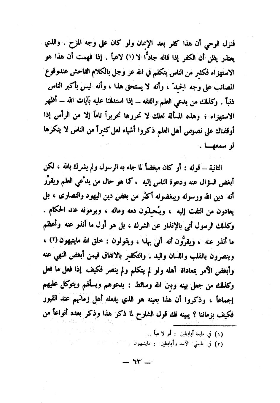 الثانية: قوله: أو كان مبغضًا لما جاء به الرسول، ولم يشرك بالله، لكن أبغض السؤال عنه ودعوة الناس إليه، كما هو حال من يدعي العلم، ويقرر أنه دين الله ورسوله، ويبغضونه أكثر من بغض دين اليهود والنصارى، بل يعادون من التفت إليه، ويحلّون دمه وماله، ويرمونه عند الحكام. وكذلك الرسول أتى بالإنذار عن الشرك، بل هو أول ما أنذر عنه، وأعظم ما أنذر عنه، ويقرون أنه أتى بهذا، ويقولون: خلق الله ما يتيهون 2، وينصرون بالقلب واللسان واليد. والتكفير بالاتفاق فيمن أبغض النهي عنه، وأبغض الأمر بمعاداة أهله، ولو لم يتكلم ولم ينصر، فكيف إذا فعل ما فعل.