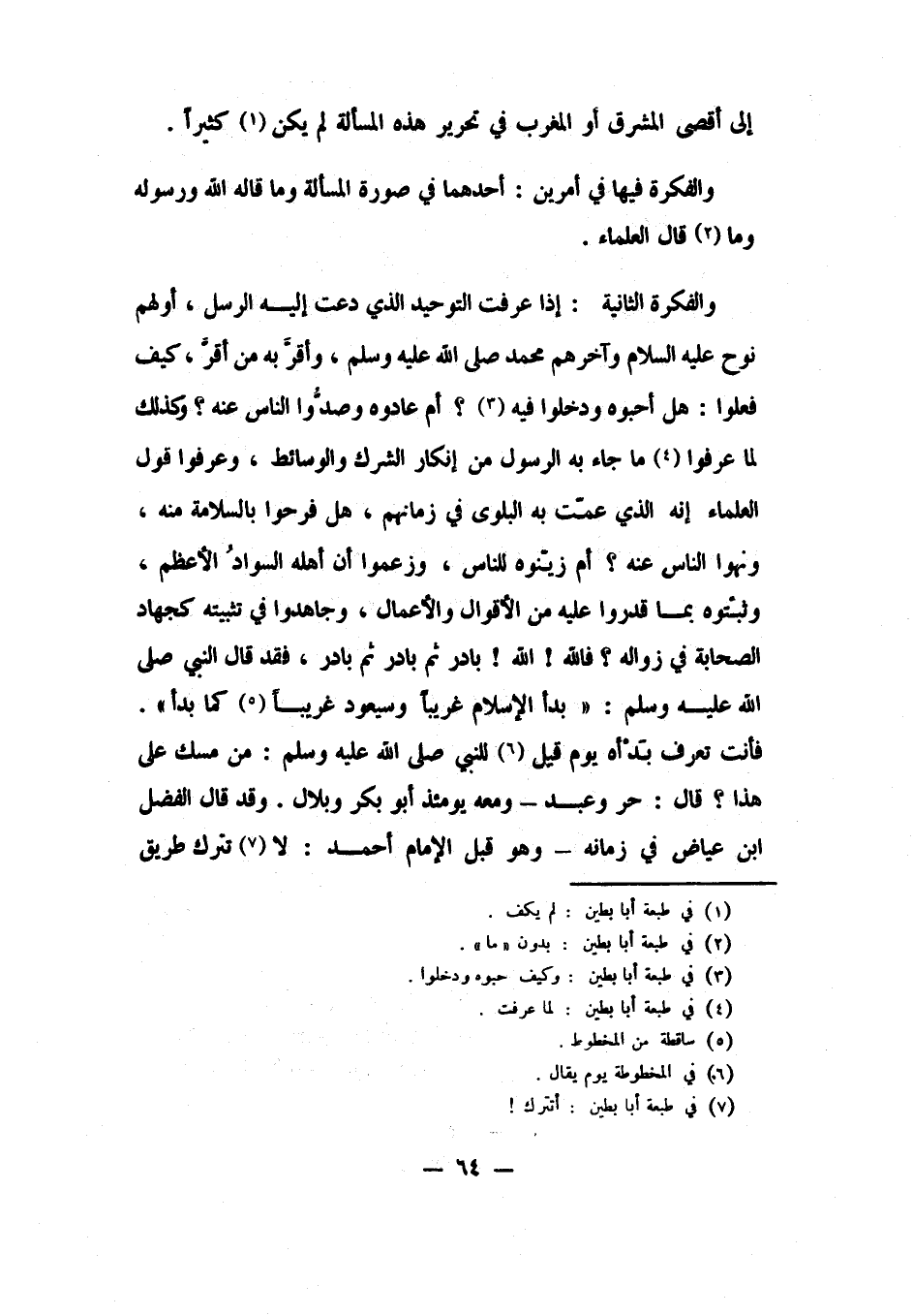 والفكرة الثانية: إذا عرفت التوحيد الذي دعت إليه الرسل، أولهم نوح عليه السلام وآخرهم محمد صلى الله عليه وسلم، وأقر به من أقر، كيف فعلوا: هل أحبوه ودخلوا فيه 3؟ أم عادوْه وصدوا الناس عنه؟ وكذلك لما عرفوا 4 ما جاء به الرسول من إنكار الشرك والوسائط، وعرفوا قول العلماء إنه الذي عمت به البلوى في زمانهم، هل فرحوا بالسلامة منه، ونهوا الناس عنه؟ أم زينوه للناس، وزعموا أن أهله السواد الأعظم، وثبتوه بما قدروا عليه من الأقوال والأعمال، وجاهدوا في تثبيته كجهاد الصحابة في زواله؟ فالله! الله! بادر ثم بادر ثم بادر، فقد قال النبي صلى الله عليه وسلم: " بدأ الإسلام غريبًا، وسيعود غريبًا 5 كما بدأ ". فأنت تعرف بدْأه يوم قيل 6 للنبي صلى الله عليه وسلم: "من معك على هذا؟ قال: حر وعبد، ومعه يومئذ أبو بكر وبلال " 7. وقد قال الفضيل بن عياض في زمانه، وهو قبل الإمام أحمد: لا تترك 8 طريق