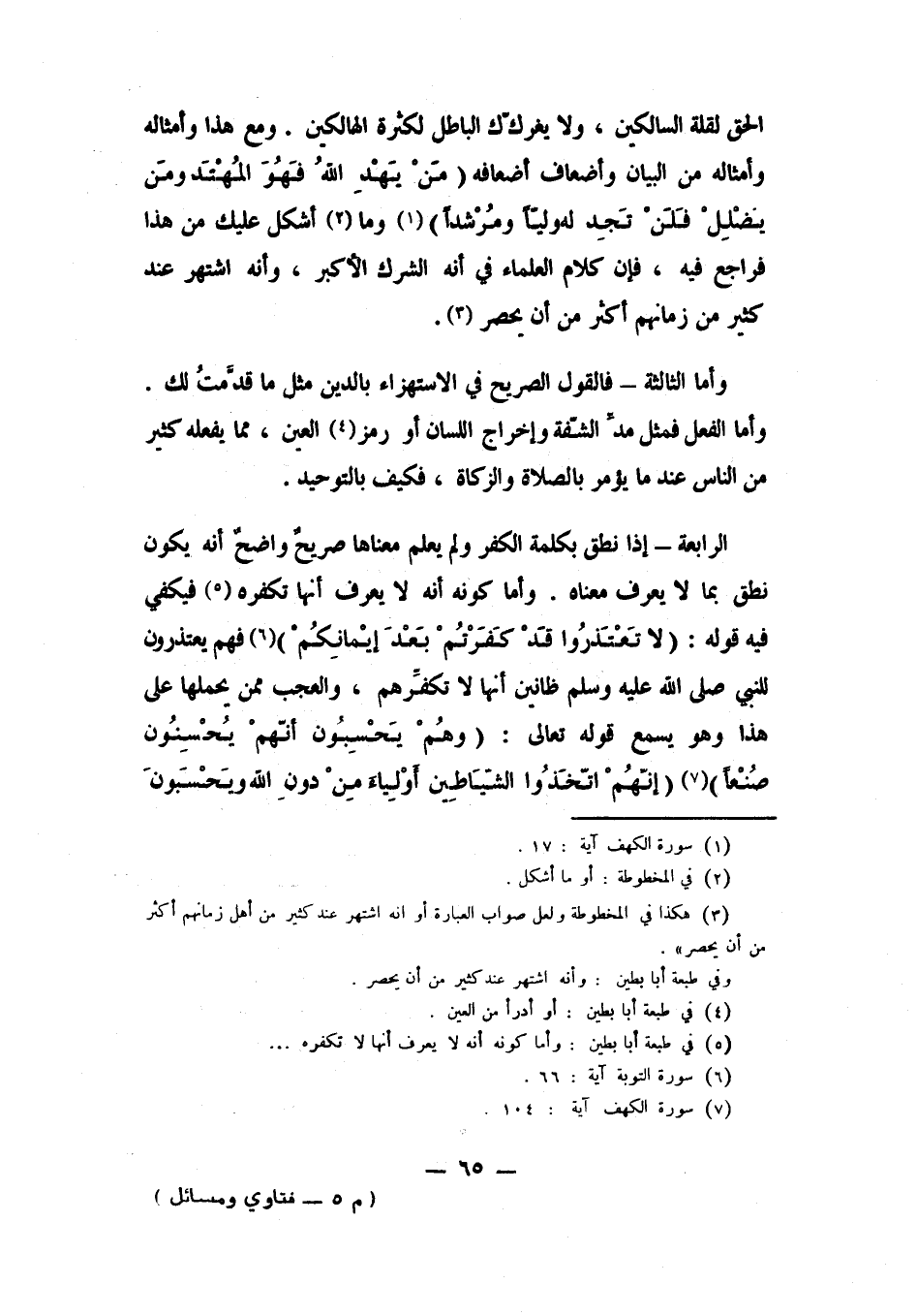 الرابعة: إذا نطق بكلمة الكفر ولم يعلم معناها، صريح واضح أنه يكون نطق بما لا يعرف معناه. وأما كونه أنه لا يعرف أنها تكفِّره 5 فيكفي فيه قوله: {لا تَعْتَذِرُوا قَدْ كَفَرْتُمْ بَعْدَ إِيمَانِكُمْ} 6، فهم يعتذرون للنبي صلى الله عليه وسلم ظانين أنها لا تكفِّرهم، والعجب ممن يحملها على هذا، وهو يسمع قوله تعالى: {وَهُمْ يَحْسَبُونَ أَنَّهُمْ يُحْسِنُونَ صُنْعاً} 7،: {إِنَّهُمُ اتَّخَذُوا الشَّيَاطِينَ أَوْلِيَاءَ مِنْ دُونِ اللَّهِ وَيَحْسَبُونَ