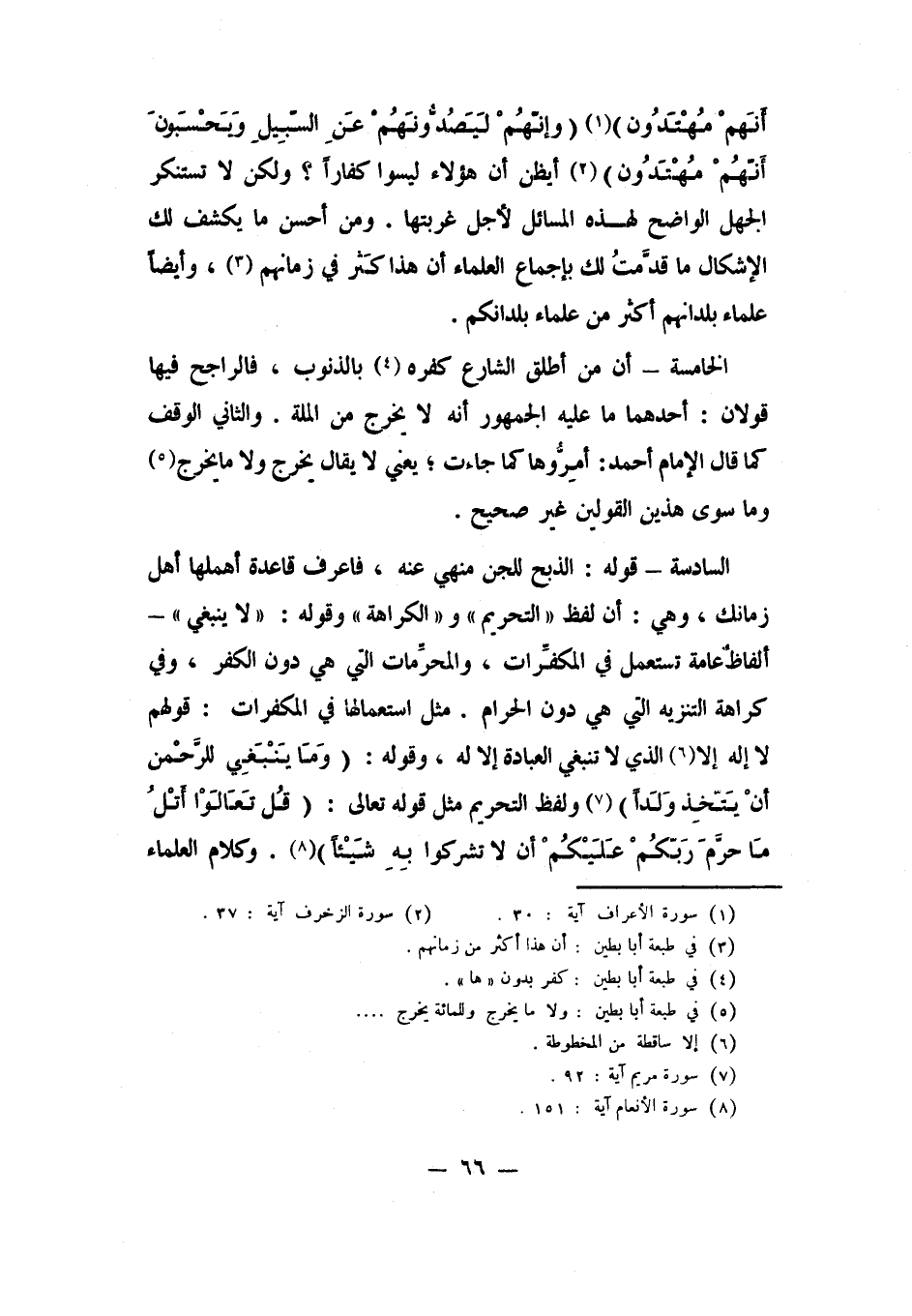 السادسة: قوله: الذبح للجن منهي عنه، فاعرف قاعدة أهملها أهل زمانك، وهي: أن لفظ "التحريم" و"الكراهة" وقوله: "لا ينبغي": ألفاظ عامة تستعمل في المكفرات، والمحرمات التي هي دون الكفر، وفي كراهة التنزيه التي هي دون الحرام.