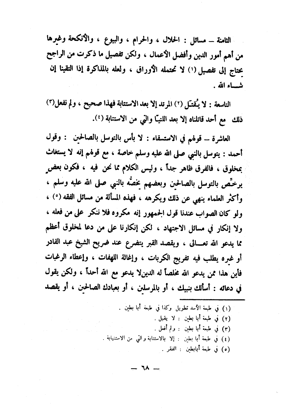 العاشرة: قولهم في الاستسقاء: لا بأس بالتوسل بالصالحين، وقول أحمد: يتوسل بالنبي صلى الله عليه وسلم خاصة، مع قولهم: إنه لا يستغاث بمخلوق، فالفرق ظاهر جدًا، وليس الكلام مما نحن فيه؛ فكون بعض يرخص بالتوسل بالصالحين وبعضهم يخصه بالنبي صلى الله عليه وسلم، وأكثر العلماء ينهى عن ذلك ويكرهه، فهذه المسألة من مسائل الفقه 5، ولو كان الصواب عندنا: قول الجمهور: إنه مكروه، فلا ننكر على من فعله؛ ولا إنكار في مسائل الاجتهاد، لكن إنكارنا على من دعا لمخلوق أعظم مما يدعو الله تعالى، ويقصد القبر يتضرع عند ضريح الشيخ عبد القادر أو غيره، يطلب فيه تفريج الكربات، وإغاثة اللهفات، وإعطاء الرغبات. فأين هذا ممن يدعو الله مخلصًا له الدين لا يدعو مع الله أحدًا، ولكن يقول في دعائه: أسألك بنبيك، أو بالمرسلين، أو بعبادك الصالحين، أو يقصد