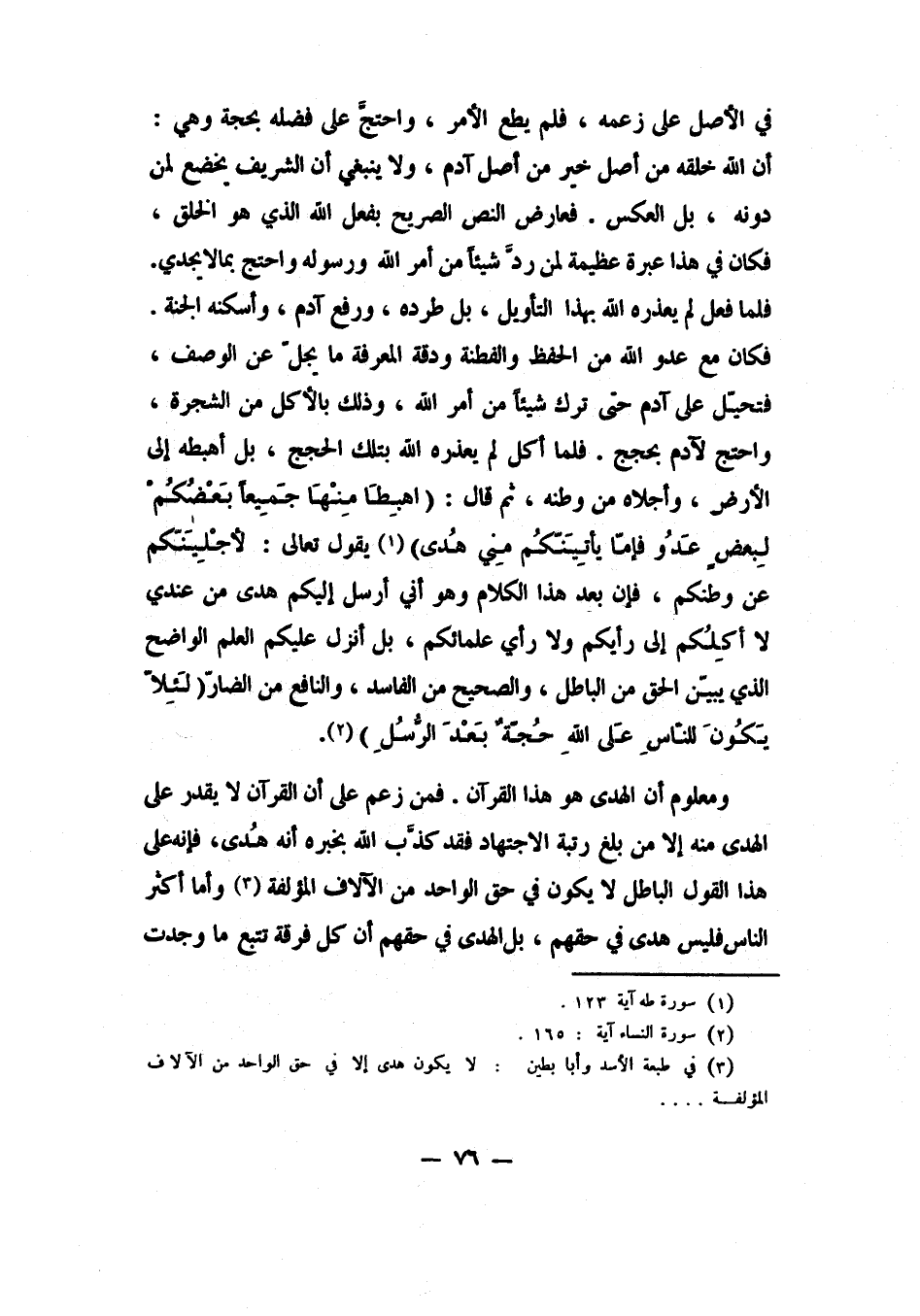 ومعلوم أن الهدى هو هذا القرآن. فمن زعم على أن القرآن لا يقدر على الهدى منه إلا من بلغ رتبة الاجتهاد، فقد كذَّب الله بخبره أنه هدى؛ فإنه على هذا القول الباطل لا يكون في حق الواحد من الآلاف المؤلفة 3، وأما أكثر الناس فليس هدى في حقهم، بل الهدى في حقهم أن كل فرقة تتبع ما وجدت