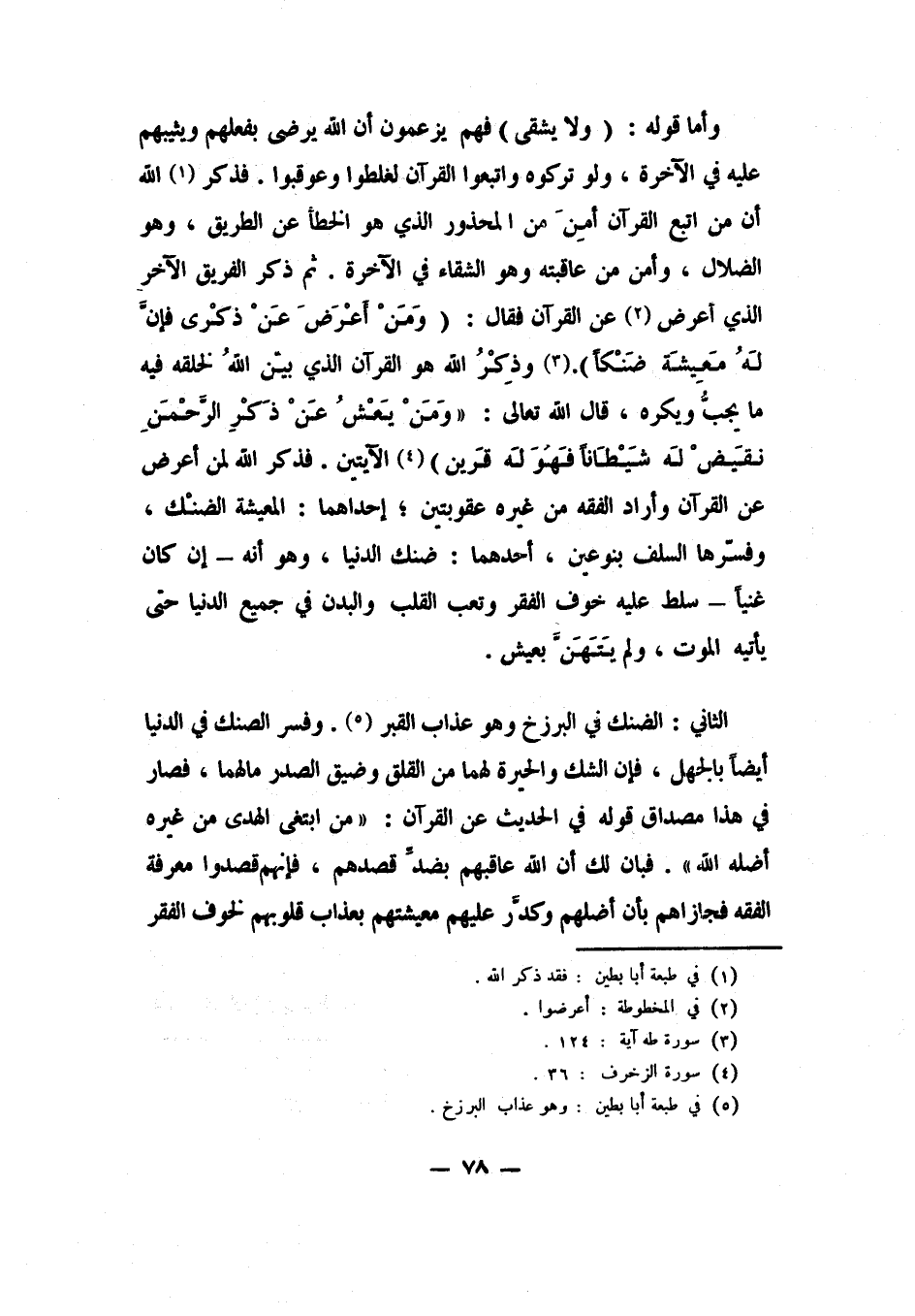 ثم ذكر الفريق الآخر الذي أعرض 2 عن القرآن فقال: {وَمَنْ أَعْرَضَ عَنْ ذِكْرِي فَإِنَّ لَهُ مَعِيشَةً ضَنْكاً} 3. وذكر الله هو: القرآن الذي بين الله لخلقه فيه ما يحب ويكره، قال الله تعالى: {وَمَنْ يَعْشُ عَنْ ذِكْرِ الرَّحْمَنِ نُقَيِّضْ لَهُ شَيْطَاناً فَهُوَ لَهُ قَرِينٌ} 4 الآيتين. فذكر الله لمن أعرض عن القرآن وأراد الفقه من غيره عقوبتين: إحداهما: المعيشة الضنك، وفسرها السلف بنوعين: