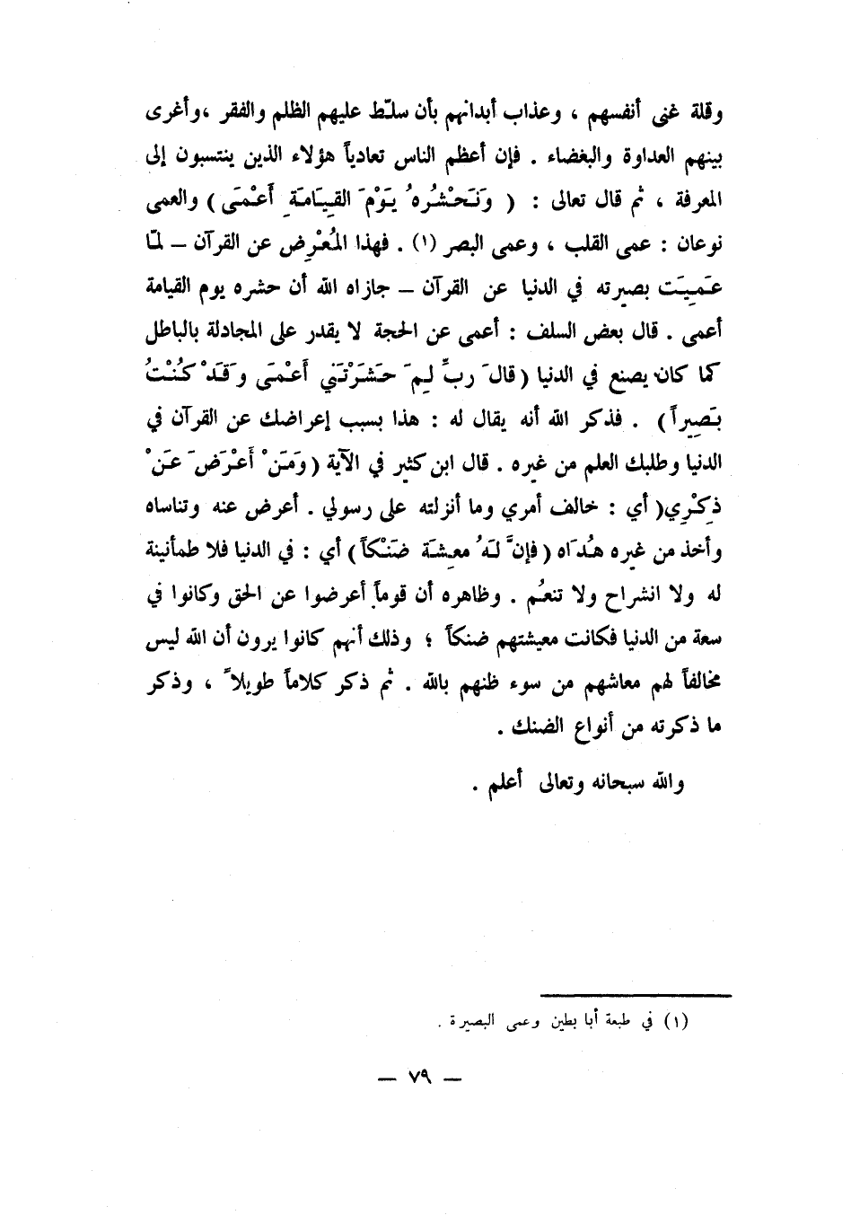 قال ابن كثير في الآية: {وَمَنْ أَعْرَضَ عَنْ ذِكْرِي} 4: أي: خالف أمري وما أنزلته على رسولي، أعرض عنه وتناساه، وأخذ من غيره هداه. {فَإِنَّ لَهُ مَعِيشَةً ضَنْكاً} 5: أي: في الدنيا فلا طمأنينة له ولا انشراح ولا تنعم. وظاهره: أن قوماً أعرضوا عن الحق، وكانوا في سعة من الدنيا، فكانت معيشتهم ضنكًا; وذلك أنهم كانوا يرون أن الله ليس مخالفًا لهم معاشهم من سوء ظنهم بالله. ثم ذكر كلامًا طويلاً، وذكر ما ذكرته من أنواع الضنك. والله سبحانه وتعالى أعلم.