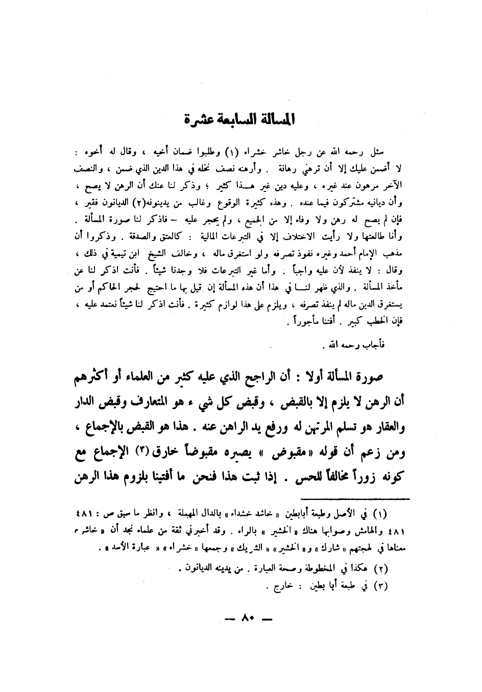 سئل، رحمه الله: عن رجل خاشر خشراء 1 وطلبوا ضمان أخيه، وقال له أخوه: لا أضمن عليك إلا أن ترهني رهانة. وأرهنه نصف نخله في هذا الديْن الذي ضمن، والنصف الآخر مرهون عند غيره، وعليه ديْن غير هذا كثير. وذكر لنا عنك أن الرهن لا يصح، وأن ديانيه مشتركون فيما عنده. وهذه كثيرة الوقوع وغالب من يدينونه الديانون 2 فقير، فإن لم يصح له رهن ولا وفاء إلا من الجميع، ولم يحجر عليه، فاذكر لنا صورة المسألة. وأنا طالعتها ولا رأيت الاختلاف إلا في التبرعات المالية: كالعتق والصدقة. وذكروا أن مذهب الإمام أحمد وغيره، نفوذ تصرفه ولو استغرق ماله، وخالف الشيخ ابن تيمية في ذلك، وقال: لا ينفذ لأن عليه واجبًا. وأما غير التبرعات، فلا وجدنا شيئًا. فأنت، اذكر لنا عن مأخذ المسألة. والذي ظهر لنا في هذا أن هذه المسألة إن قيل بها ما احتيج لحجر الحاكم، أو من يستغرق الدين ماله لم ينفذ تصرفه، ويلزم على هذا لوازم كثيرة. فأنت اذكر لنا شيئًا نعتمد عليه، فإن الخطب كبير. أفتنا مأجورًا.