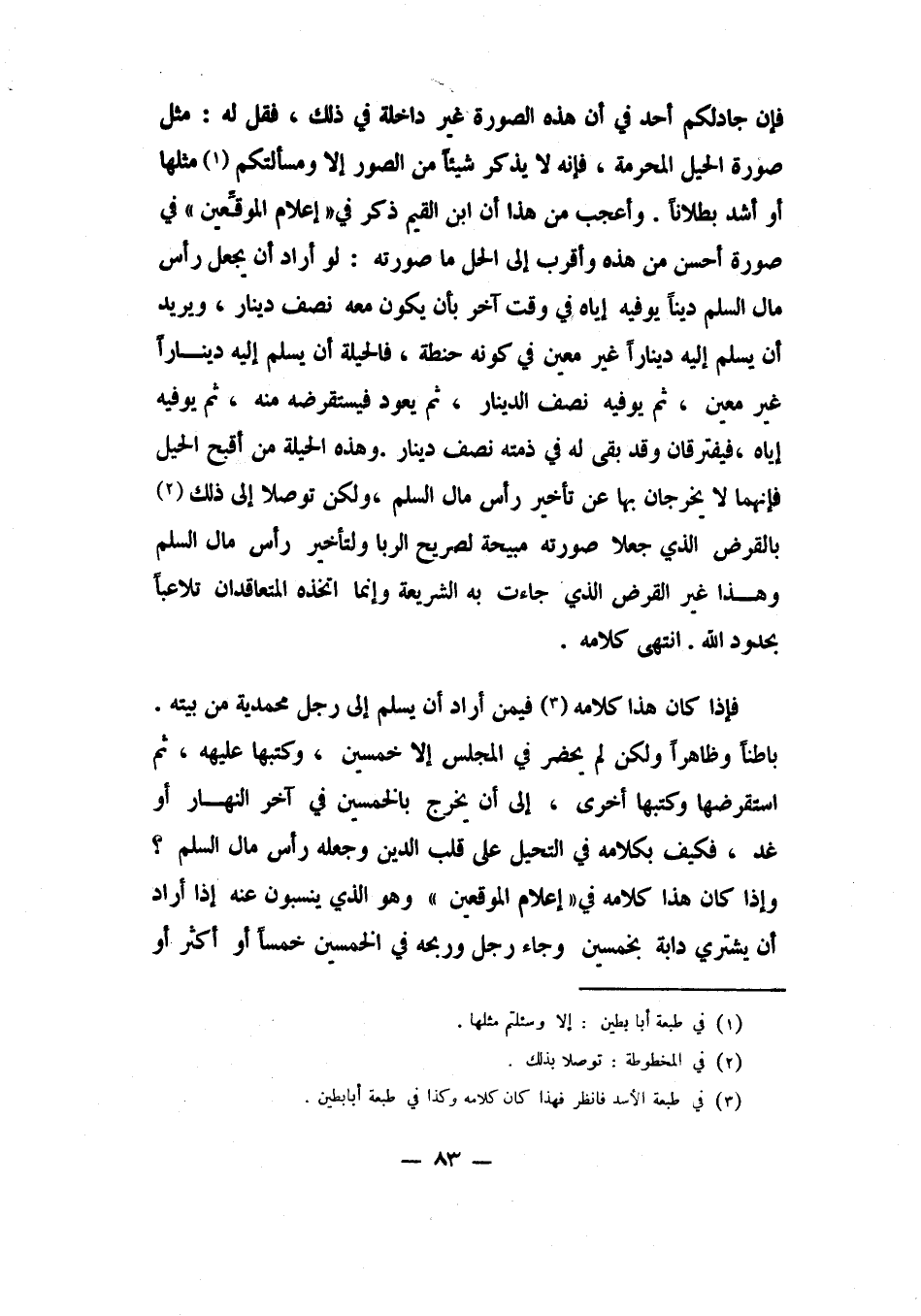 وأعجب من هذا: أن ابن القيم ذكر في إعلام الموقعين في صورة أحسن من هذه وأقرب إلى الحل، ما صورته: لو أراد أن يجعل رأس مال السلم ديناً يوفيه إياه في وقت آخر بأن يكون معه نصف دينار، ويريد أن يسلم إليه دينارًا غير معين في كونه حنطة، فالحيلة أن يسلم إليه ديناراً غير معين، ثم يوفيه نصف الدينار، ثم يعود فيستقرضه منه، ثم يوفيه إياه، فيفترقان وقد بقي له في ذمته نصف دينار. وهذه الحيلة من أقبح الحيل؛ فإنهما لا يخرجان بها عن تأخير رأس مال السلم، ولكن توصلا إلى ذلك 2 بالقرض الذي جعلا صورته مبيحة لصريح الربا ولتأخير رأس مال السلم، وهذا غير القرض الذي جاءت به الشريعة، وإنما اتخذه المتعاقدان تلاعبًا بحدود الله. انتهى كلامه.