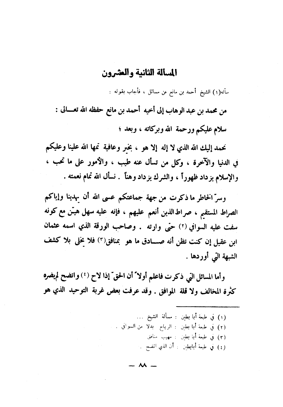 سأله الشيخ 1 أحمد بن مانع عن مسائل، فأجاب بقوله: من محمد بن عبد الوهاب، إلى أخيه أحمد بن مانع، حفظه الله تعالى؛ سلام عليكم ورحمة الله وبركاته.
