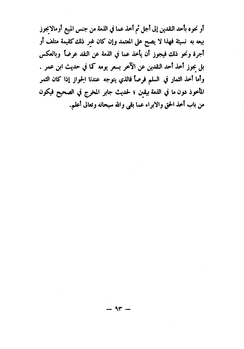 أو نحوه بأحد النقدين إلى أجل، ثم أخذ عما في الذمة من جنس المبيع، أو ما لا يجوز بيعه به نسيئة، فهذا لا يصح على المعتمد، وإن كان غير ذلك كقيمة متلف أو أجرة ونحو ذلك، فيجوز أن يأخذ عما في الذمة عن النقد عرضاً وبالعكس؛ بل يجوز أخذ أحد النقدين عن الآخر بسعر يومه، كما في حديث ابن عمر. وأما أخذ الثمار في السلم فرصاً، فالذي يتوجه عندنا: الجواز إذا كان الثمر المأخوذ دون ما في الذمة بيقين، لحديث جابر المخرج في الصحيح؛ فيكون من باب أخذ الحق والإبراء عما بقي. والله سبحانه وتعالى أعلم.