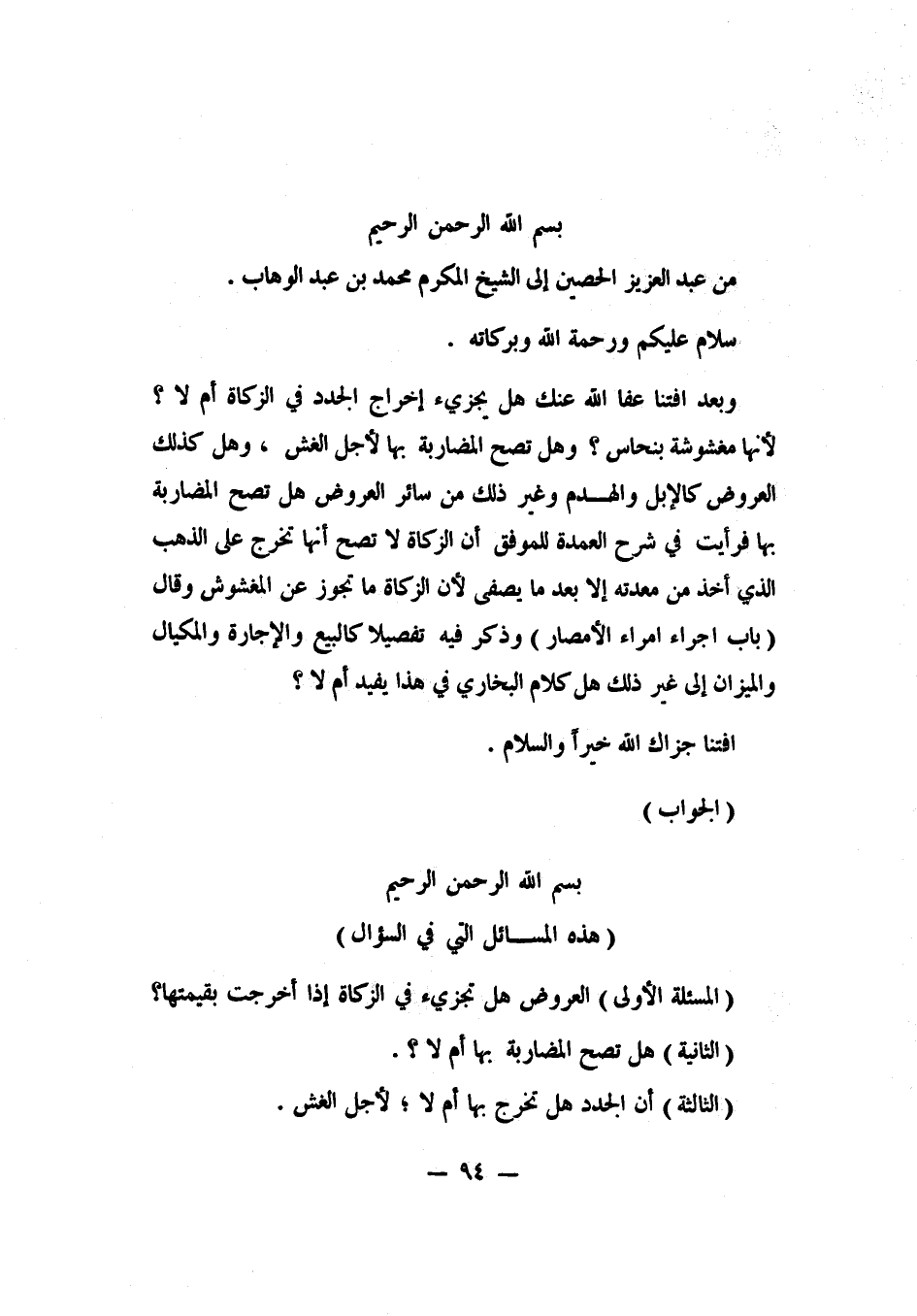 وبعد، أفتنا، عفا الله عنك، هل يجزئ إخراج الجدد في الزكاة أم لا؟ لأنها مغشوشة بنحاس؟ وهل تصح المضاربة بها لأجل الغش؟ وهل كذلك العروض كالإبل والهدم وغير ذلك من سائر العروض، هل تصح المضاربة بها؟ فرأيت في شرح العمدة للموفق أن الزكاة لا تصح أنها تخرج على الذهب الذي أخذ من معدنه، إلا بعد ما يصفى، لأن الزكاة ما تجوز عن المغشوش. وقال: باب إجراء أمراء الأمصار، وذكر فيه تفصيلاً كالبيع والإجارة والمكيال والميزان إلى غير ذلك، هل كلام البخاري في هذا يفيد أم لا؟ أفتنا جزاك الله خيراً. والسلام.