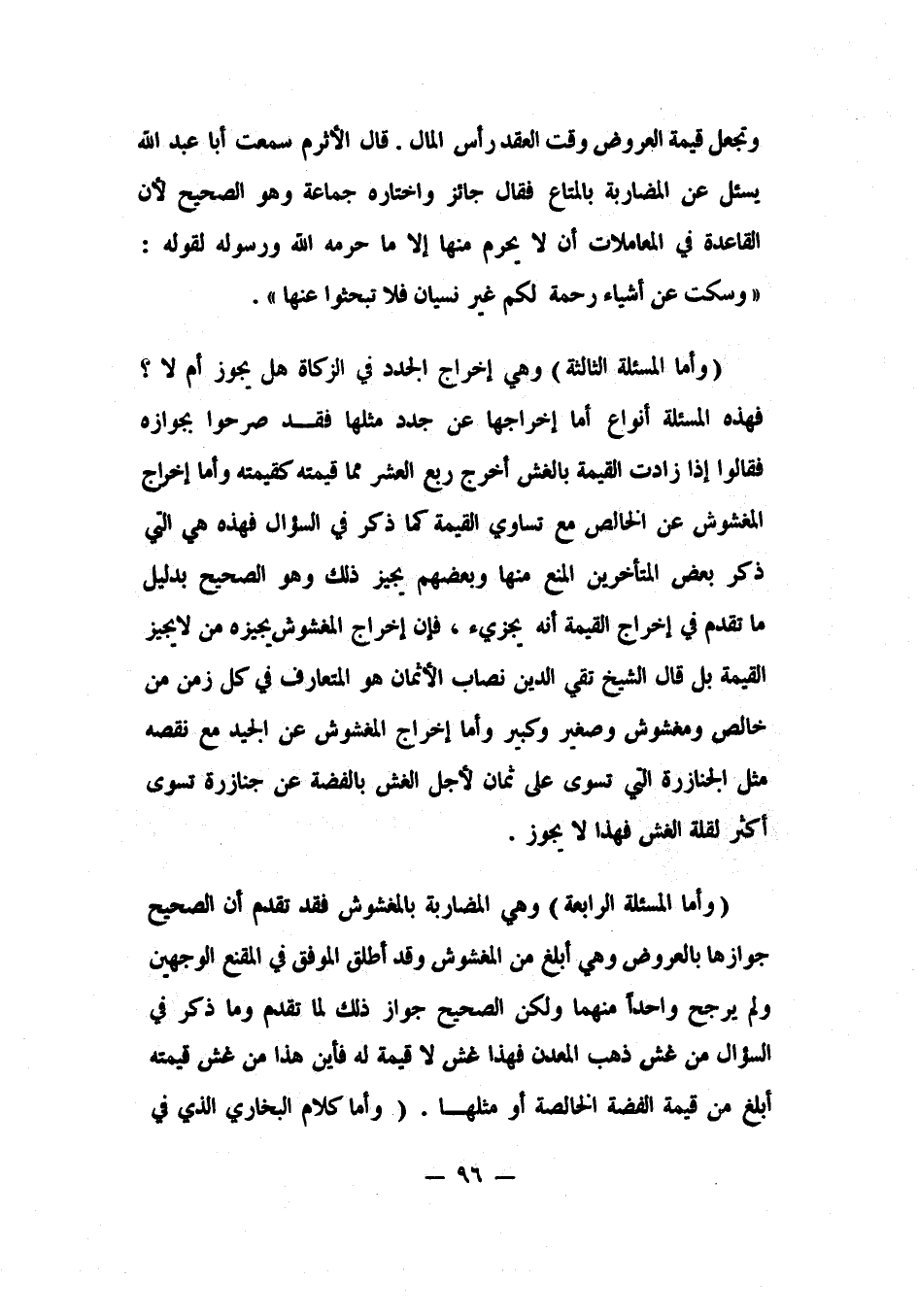وأما المسألة الرابعة، وهي المضاربة بالمغشوش، فقد تقدم أن الصحيح جوازها بالعروض، وهي أبلغ من المغشوش. وقد أطلق الموفق في المقنع الوجهين، ولم يرجح واحداً منهما؛ ولكن الصحيح: جواز ذلك، لما تقدم. وما ذكر في السؤال من غش ذهب المعدن، فهذا غش لا قيمة له، فأين هذا مَن غش قيمته أبلغ من قيمة الفضة الخالصة أو مثلها؟