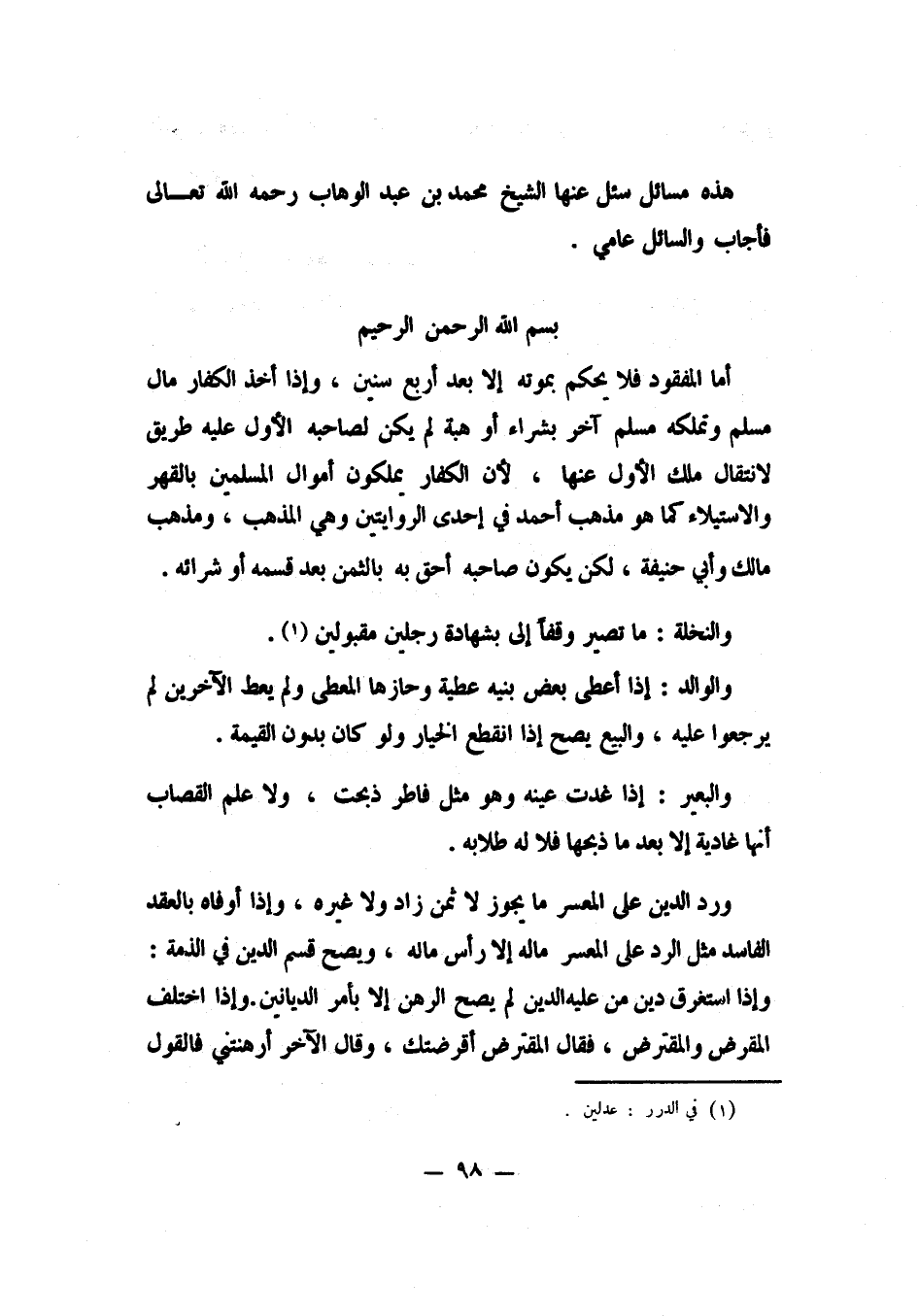 كتاب فتاوى ومسائل (مطبوع ضمن مؤلفات الشيخ محمد بن عبد الوهاب، الجزء الرابع)