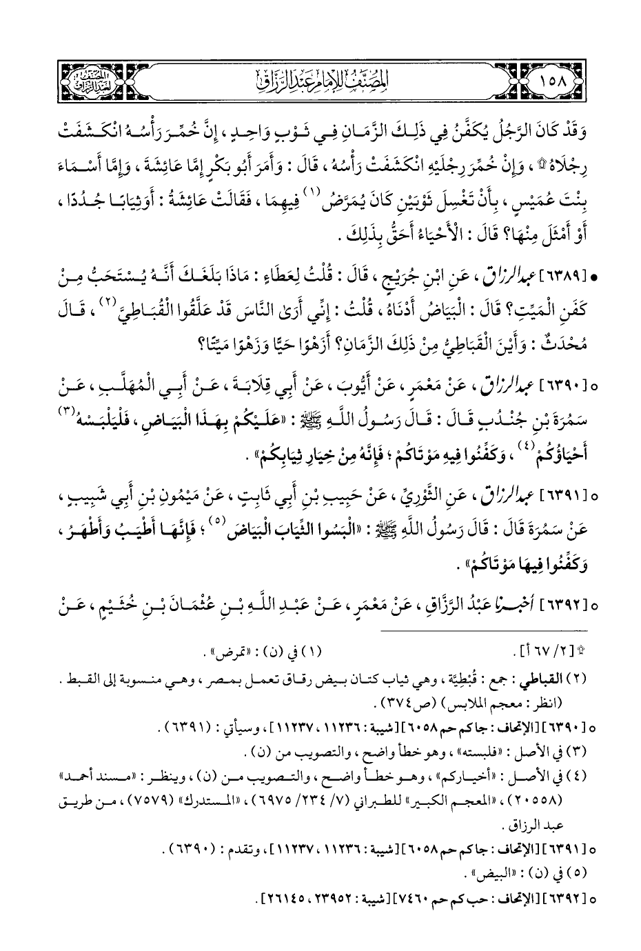 • [٦٣٨٩] عبد الرزاق، عَنِ ابْنِ جُرَيْجٍ، قَالَ: قُلْتُ لِعَطَاءٍ: مَاذَا بَلَغَكَ أَنَّهُ يُسْتَحَبُّ مِنْ كَفَنِ الْمَيِّتِ؟ قَالَ: الْبَيَاضُ أَدْنَاهُ، قُلْتُ: إِنَي أَرَى النَّاسَ قَدْ عَلَّقُوا الْقُبَاطِيَّ (¬٢)، قَالَ مُحْدَثٌ: وَأَيْنَ الْقَبَاطِيُّ مِنْ ذَلِكَ الزَّمَانِ؟ أَزَهْوًا حَيًّا وَزَهْوًا مَيتًا؟