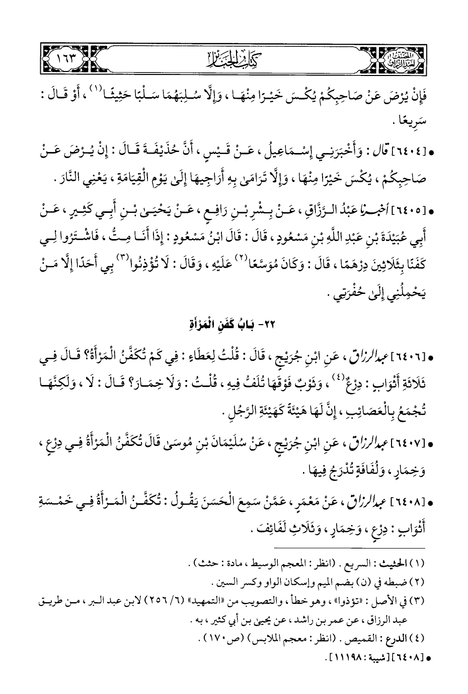 • [٦٤٠٦] عبد الرزاق، عَنِ ابْنِ جُرَيْجٍ، قَالَ: قُلْتُ لِعَطَاءٍ: فِي كَمْ تُكَفَّنُ الْمَرْأَةُ؟ قَالَ فِي ثَلَاثَةِ أَثْوَابٍ: دِرْعٌ (¬٤)، وَثَوْبٌ فَوْقَهَا تُلَفُّ فِيهِ، قُلْتُ: وَلَا خِمَارَ؟ قَالَ: لَا، وَلَكِنَّهَا تُجْمَعُ بِالْعَصَائِبِ، إِنَّ لَهَا هَيْئَةَ كَهَيْئَةِ الرَّجُلِ.