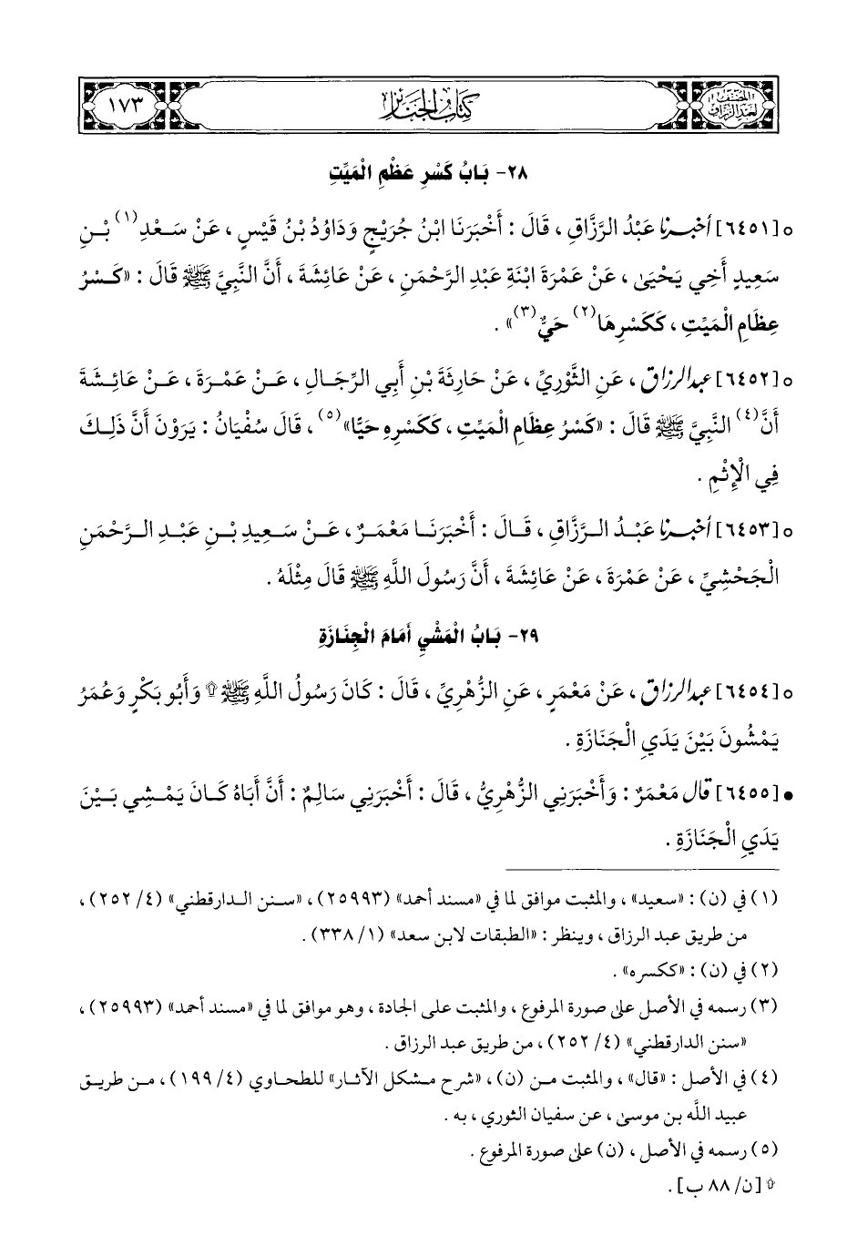 ° [٦٤٥١] أخبرنا عَبْدُ الرَّزَّاقِ، قَالَ: أَخْبَرَنَا ابْنُ جُرَيْجٍ وَدَاوُدُ بْنُ قَيْسٍ، عَنْ سَعْدِ (¬١) بْنِ سَعِيدٍ أَخِي يَحْيَى، عَنْ عَمْرَةَ ابْنَةِ عَبْدِ الرَّحْمَنِ، عَنْ عَائِشَةَ، أَنَّ النَّبِيَّ - صلى الله عليه وسلم - قَالَ: "كَسرُ عِظَامِ الْمَيِّتِ، كَكَسْرِهَا (¬٢) حَيٌّ (¬٣) ".