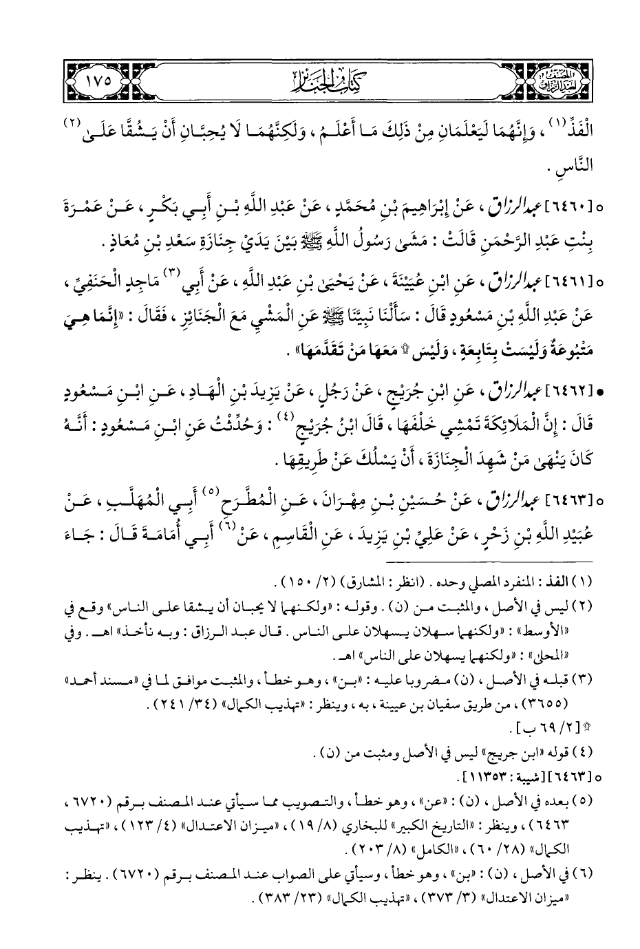• [٦٤٦٢] عبد الرزاق، عَنِ ابْنِ جُرَيْجٍ، عَنْ رَجُلٍ، عَنْ يَزِيدَ بْنِ الْهَادِ، عَنِ ابْنِ مَسْعُودٍ قَالَ: إِنَّ الْمَلَائِكَةَ تَمْشِي خَلْفَهَا، قَالَ ابْنُ جُرَيْجٍ (¬٤): وَحُدِّثْتُ عَنِ ابْنِ مَسْعُودٍ: أَنَّهُ كَانَ يَنْهَى مَنْ شَهِدَ الْجِنَازَةَ، أَنْ يَسْلُكَ عَنْ طَرِيقِهَا.