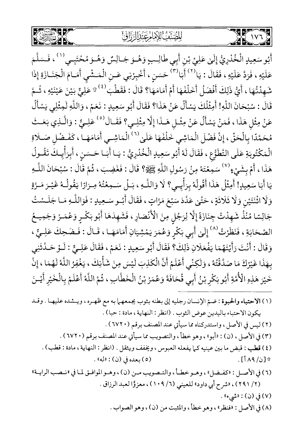 أَبُو سَعِيدٍ الْخُدْرِيُّ إِلى عَلِيِّ بْنِ أَبِي طَالِبٍ وَهُوَ جَالِسٌ وَهُوَ مُحْتَبِي (¬١)، فَسَلَّمَ عَلَيْهِ، فَرَدَّ عَلَيْهِ، فَقَالَ: يَا (¬٢) أَبَا (¬٣) حَسَنٍ، أَخْبِرْنِي عَنِ الْمَشْيِ أَمَامَ الْجَنَازَةِ إِذَا شَهِدْتُهَا، أَيُّ ذَلِكَ أَفْضَلُ أَخَلْفَهَا أَمْ أَمَامَهَا؟ قَالَ: فَقَطَّبَ (¬٤) * عَلِيٌّ بَيْنَ عَيْنَيْهِ، ثُمَّ قَالَ: سُبْحَانَ اللهِ! أَمِثْلُكَ يَسْأَلُ عَنْ هَذَا؟ فَقَالَ أَبُو سَعِيدٍ: نَعَمْ، وَالله لَمِثْلِي يَسْأَلُ عَنْ مِثْلِ هَذَا، فَمَنْ يَسْأَلُ عَنْ مِثْلِ هَذَا إِلَّا مِثْلِي؟ فَقَال (¬٥) عَلِيٌّ: وَالَّذِي بَعَثَ مُحَمَّدًا بِالْحَقِّ، إِنَّ فَضْلَ الْمَاشِي خَلْفَهَا عَلَى (¬٦) الْمَاشِي أَمَامَهَا، كَفَضلِ صَلَاةِ الْمَكْتُوبَةِ عَلَى التَّطَوُّعِ، فَقَالَ لَهُ أَبُو سَعِيدٍ الْخُدْرِيُّ: يَا أَبَا حَسَنٍ، أَبِرَأْيِكَ تَقُولُ هَذَا، أَمْ بِشَيءٍ (¬٧) سَمِعْتَهُ مِنْ رَسُولِ اللَّهِ - صلى الله عليه وسلم -؟ قَالَ: فَغَضِبَ، ثُمَّ قَالَ: سُبْحَانَ الله يَا أَبَا سَعِيدٍ! أَمِثْلُ هَذَا أَقُولُهُ بِرَأْيِي؟ لَا وَاللَّهِ، بَلْ سَمِعْتُهُ مِرَارًا يَقُولُهُ غَيْرَ مَرَّةٍ وَلَا اثْنَتَيْنِ وَلَا ثَلَاثَةٍ، حَتَى عَدَّدَ سَبْعَ مَرَّاتٍ، فَقَالَ أَبُو سَعِيدٍ: فَوَاللَّهِ مَا جَلَسْتُ جَالِسًا مُنْذُ شَهِدْتُ جِنَازَةً إِلَّا لِرَجُلٍ مِنَ الْأَنْصَارِ، فَشَهِدَهَا أَبُو بَكْرٍ وَعُمَرُ وَجَمِيعُ الصَّحَابَةِ، فَنَظَرْتُ (¬٨) إِلَى أَبِي بَكْرٍ وَعُمَرَ يَمْشِيَانِ أَمَامَهَا، قَالَ: فَضَحِكَ عَلِيٌّ، وَقَالَ: أَنْتَ رَأَيْتَهُمَا يَفْعَلَانِ ذَلِكَ؟ فَقَالَ أَبُو سَعِيدٍ: نَعَمْ، فَقَالَ عَلِيٌّ: لَوْ حَدَّثَنِي بِهَذَا غَيْرُكَ مَا صدَّقْتُهُ، وَلَكِنِّي أَعْلَمُ أَنَّ الْكَذِبَ لَيْسَ مِنَ شَأْنِكَ، يَغْفِرُ اللَّهُ لَهُمَا، إِنَّ خَيْرَ هَذِهِ الْأُمَّةِ أَبُو بَكْرِ بْنُ أَبِي قُحَافَةَ وَعُمَرُ بْنُ الْخَطَّابِ، ثُمَّ اللَّهُ أَعْلَمُ بِالْخَيْرِ أَيْنَ