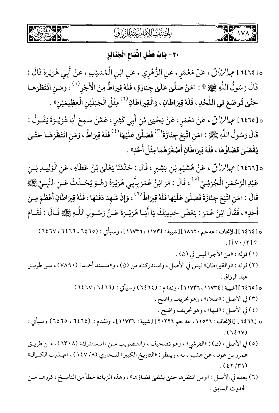 ° [٦٤٦٦] عبد الرزاق، عَنْ هُشَيْمِ بْنِ بَشِيرٍ، قَال: حَدَّثَنَا يَعْلَى بْنُ عَطَاءٍ، عَنِ الْوَلِيدِ بْنِ عَبْدِ الرَّحْمَنِ الْجُرَشِيِّ (¬٥)، قَالَ: مَرَّ ابْنُ عُمَرَ بِأَبِي هُرَيْرَةَ وَهُوَ يُحَدِّثُ عَنِ النَّبِيِّ - صلى الله عليه وسلم - قَالَ: "مَنِ اتَّبَعَ جِنَازَةً فَصَلَّى عَلَيْهَا فَلَهُ قِيرَاطٌ (¬٦)، وَإِنْ شَهِدَ دَفْنَهَا، فَلَهُ قِيرَاطَانِ أَعْظَمُ من أَحَدٍ"، فَقَالَ ابْنُ عُمَرَ: بَعْضُ حَدِيثِكَ يَا أَبَا هُرَيْرَةَ عَنْ رَسُولِ اللَّهِ - صلى الله عليه وسلم - قَالَ: فَقَامَ