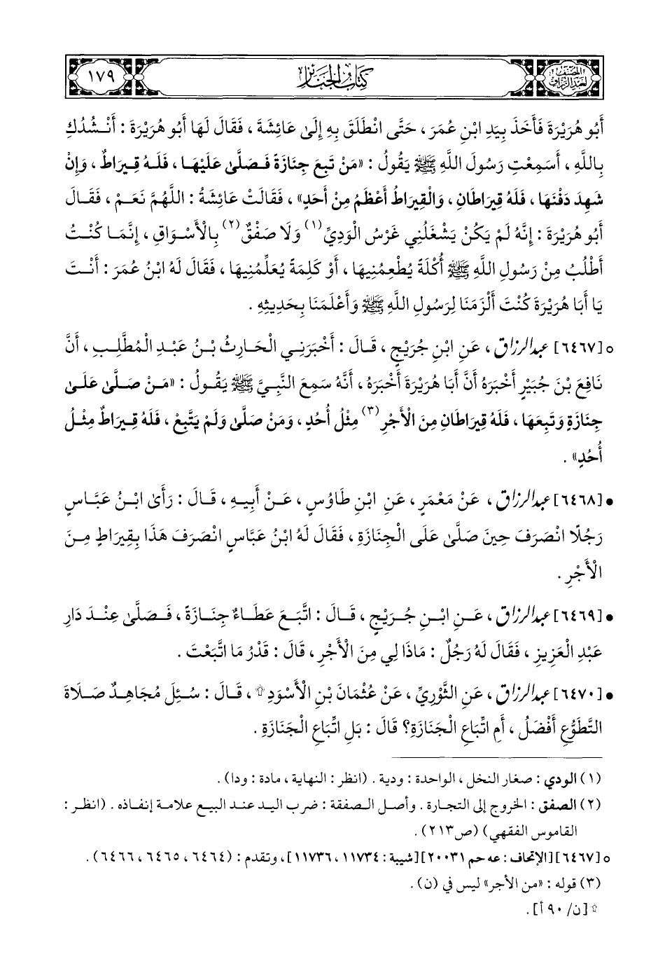 ° [٦٤٦٧] عبد الرزاق، عَنِ ابْنِ جُرَيْجٍ، قَالَ: أَخْبَرَنِي الْحَارِثُ بْنُ عَبْدِ الْمُطَّلِبِ، أَنَّ نَافِعَ بْنَ جُبَيْرٍ أَخْبَرَهُ أَنَّ أَبَا هُرَيْرَةَ أَخْبَرَهُ، أَنَّهُ سَمِعَ النَّبِيَّ - صلى الله عليه وسلم - يَقُولُ: "مَن صَلَّى عَلَى جِنَازَةٍ وَتَبِعَهَا، فَلَهُ قِيرَاطَانِ مِنَ الْأَجرِ (¬٣) مِثلُ أُحُدٍ، وَمَن صَلَّى وَلَمْ يَتَّبعْ، فَلَهُ قِيرَاطٌ مِثلُ أُحُدٍ".