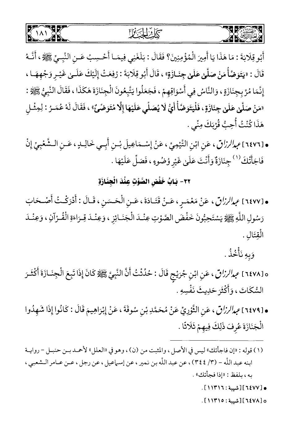 ° [٦٤٧٨] عبد الرزاق، عَنِ ابْنِ جُرَيْجٍ قَالَ: حُدِّثْتُ أَنَّ النَّبِيَّ - صلى الله عليه وسلم - كَانَ إِذَا تَبعَ الْجِنَازَةَ أكثَرَ السُّكَاتَ، وَأَكْثَرَ حَدِيثَ نَفْسِهِ.