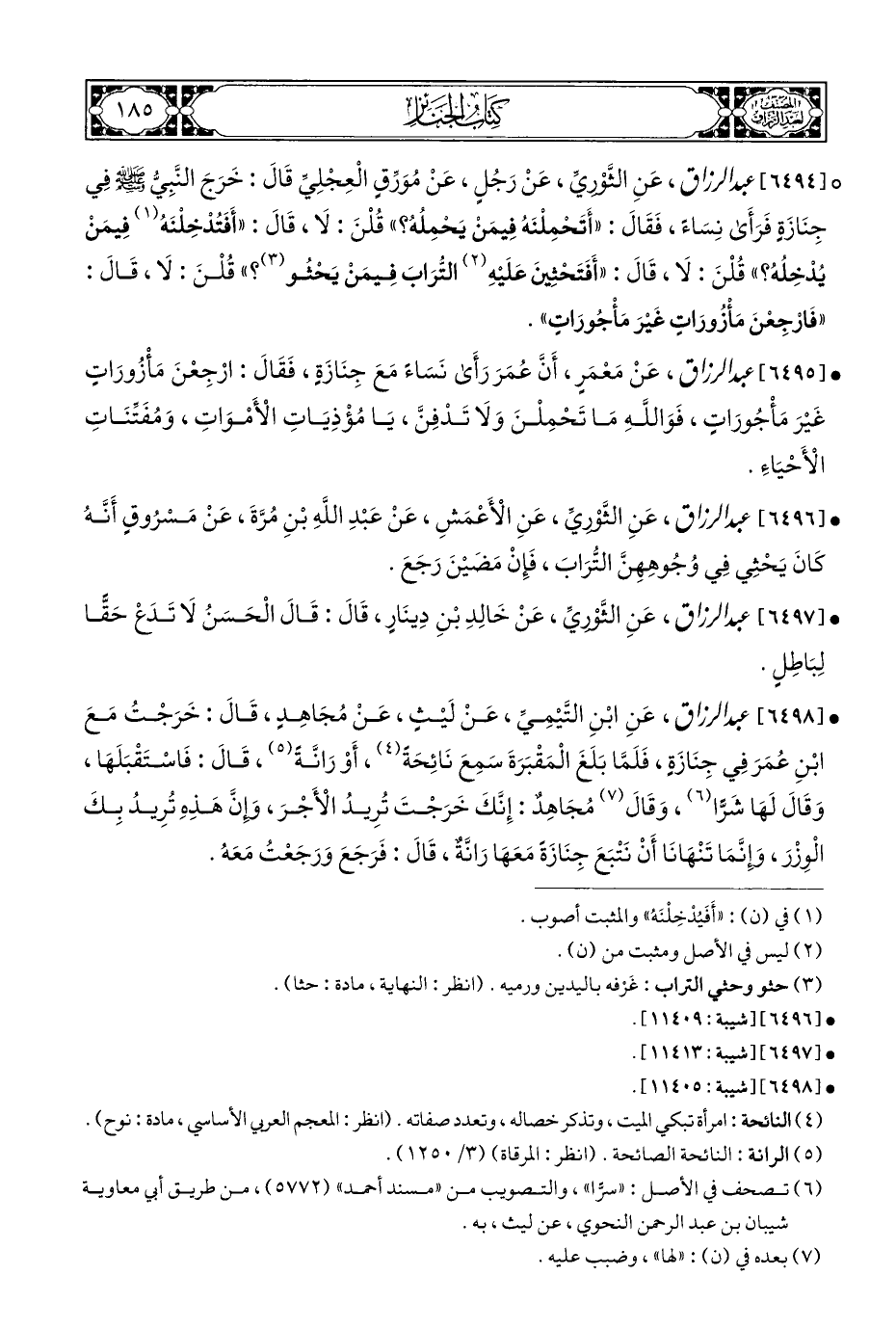 ° [٦٤٩٤] عبد الرزاق، عَنِ الثَّوْرِيِّ، عَنْ رَجُلٍ، عَنْ مُوَرِّقٍ الْعِجْلِيِّ قَالَ: خَرَجَ النَّبِيُّ - صلى الله عليه وسلم - في جِنَازَةٍ فَرَأَى نِسَاءً، فَقَالَ: "أَتَحْمِلْنَهُ فِيمَنْ يَحمِلُهُ؟ " قُلْنَ: لَا، قَالَ: "أَفَتُدْخِلْنَهُ (¬١) فِيمَنْ يُدْخِلُهُ؟ " قُلْنَ: لَا، قَالَ: "أَفَتَحْثِينَ عَلَيْهِ (¬٢) التُّرَابَ فِيمَنْ يَحْثُو (¬٣)؟ " قُلْنَ: لَا، قَالَ: "فَارْجِعْنَ مَأْزُورَاتٍ غَيْرَ مَأْجُورَاتٍ".