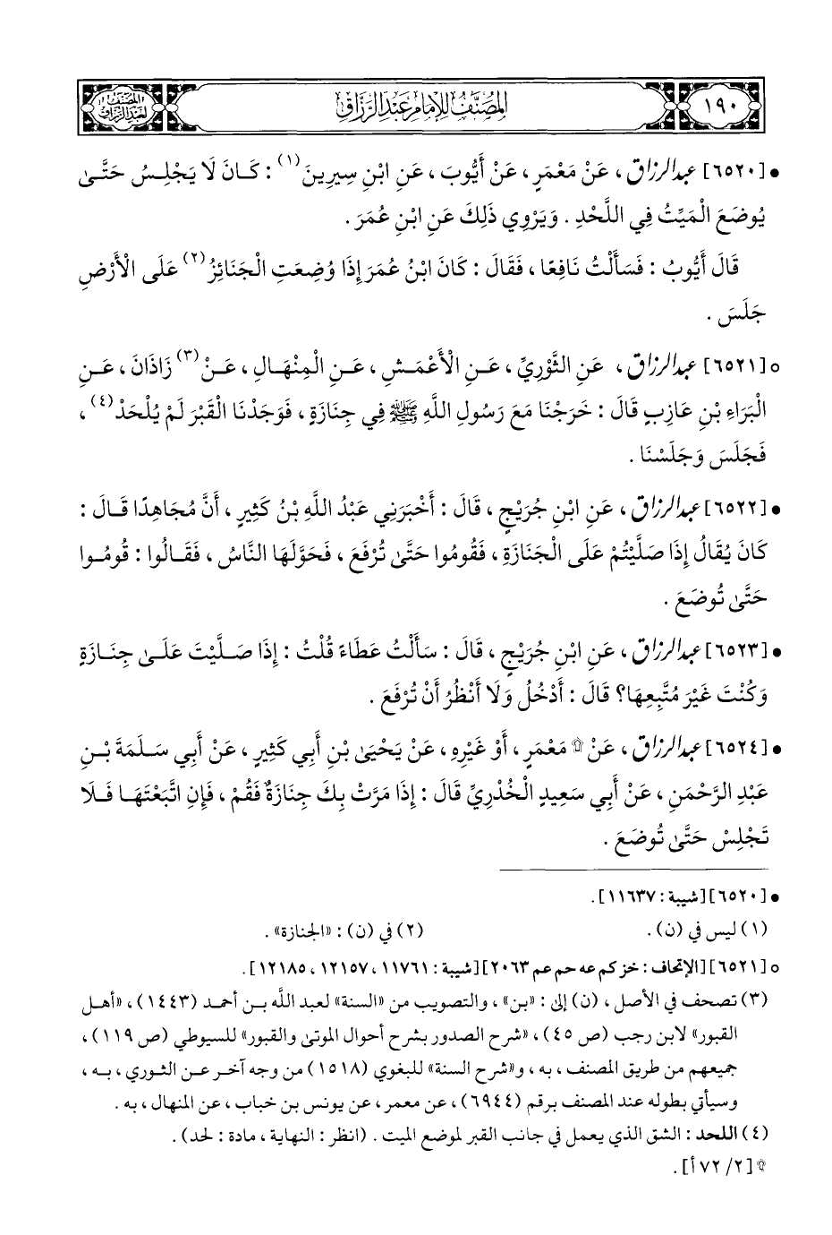 ° [٦٥٢١] عبد الرزاق، عَنِ الثَّوْرِيِّ، عَنِ الْأَعْمَشِ، عَنِ الْمِنْهَالِ، عَنْ (¬٣) زَاذَانَ، عَنِ الْبَرَاءِ بْنِ عَازِبٍ قَالَ: خَرَجْنَا مَعَ رَسُولِ اللَهِ - صلى الله عليه وسلم - فِي جِنَازَةٍ، فَوَجَدْنَا الْقَبْرَ لَمْ يُلْحَدْ (¬٤)، فَجَلَسَ وَجَلَسْنَا.