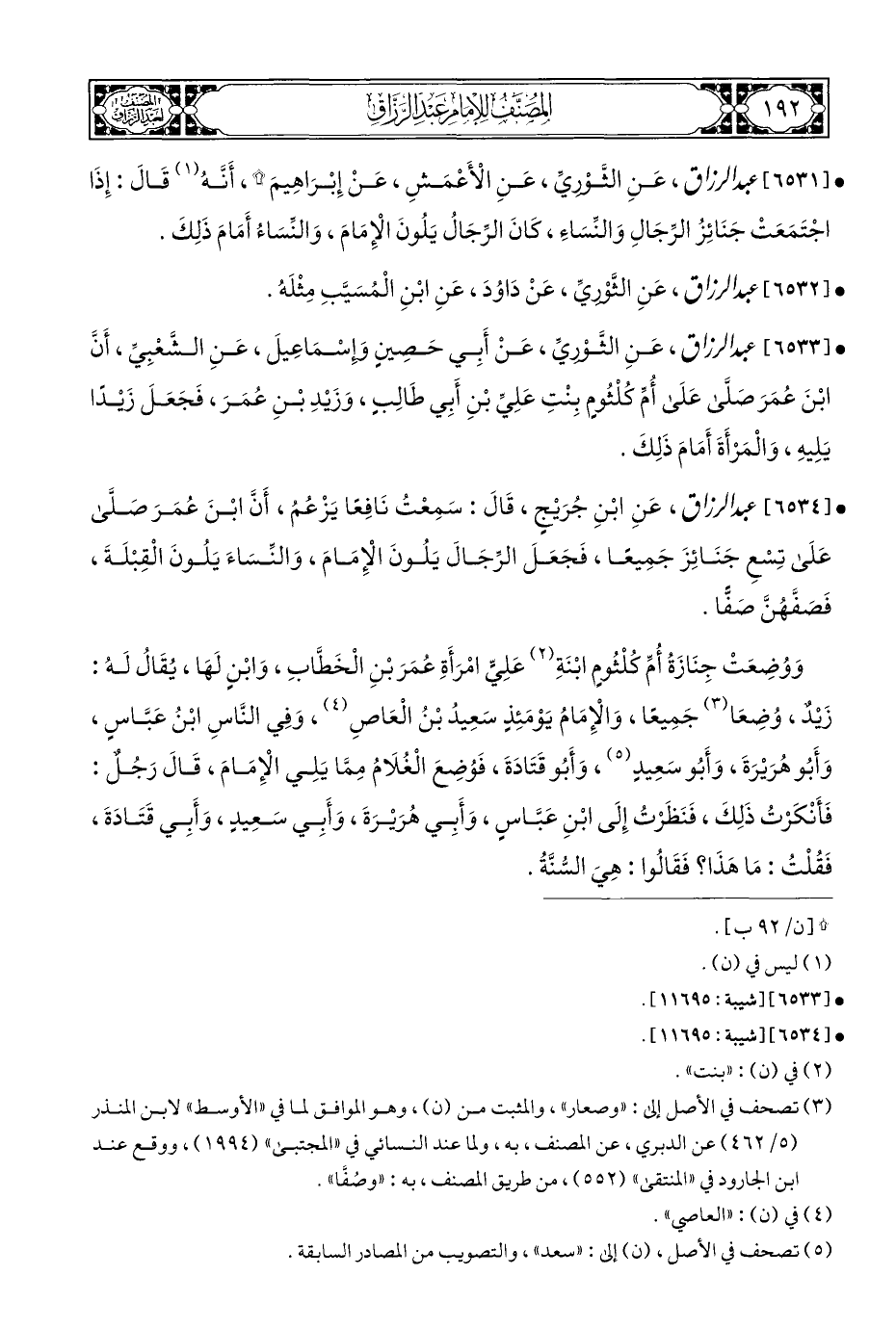 • [٦٥٣٤] عبد الرزاق، عَنِ ابْنِ جُرَيْجٍ، قَالَ: سَمِعْتُ نَافِعًا يَزْعُمُ، أَنَّ ابْنَ عُمَرَ صَلَّى عَلَى تِسْعِ جَنَائِزَ جَمِيعًا، فَجَعَلَ الرِّجَال يَلُونَ الْإِمَامَ، وَالنِّسَاءَ يَلُونَ الْقِبْلَةَ، فَصفَّهُنَّ صَفًّا.
