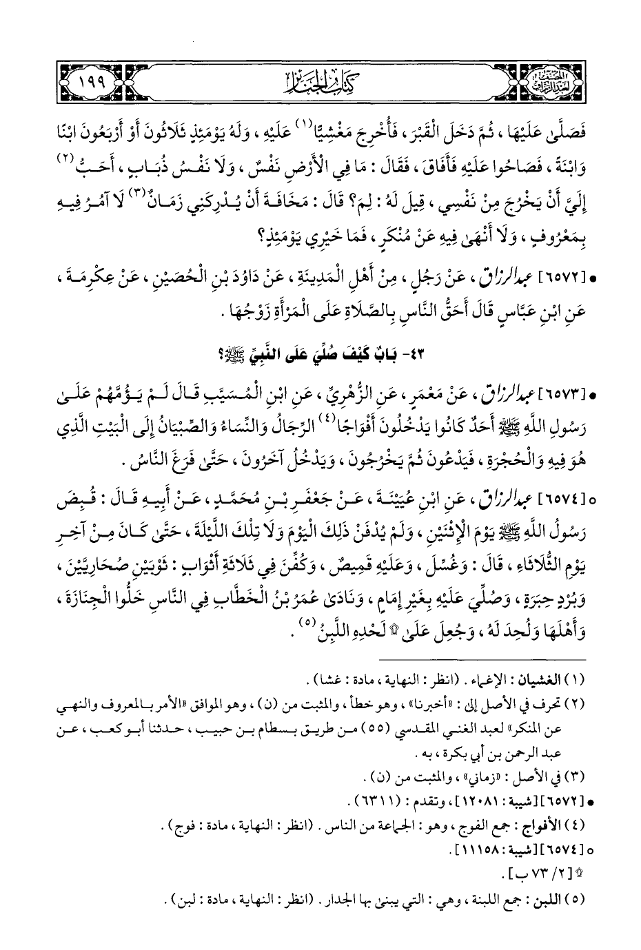 ° [٦٥٧٤] عبد الرزاق، عَنِ ابْنِ عُيَيْنَةَ، عَنْ جَعْفَرِ بْنِ مُحَمَّدٍ، عَنْ أَبِيهِ قَالَ: قُبِضَ رَسُولُ اللهِ - صلى الله عليه وسلم - يَوْمَ الْإِثْنَيْنِ، وَلَمْ يُدْفَنْ ذَلِكَ الْيَوْمَ وَلَا تِلْكَ اللَّيْلَةَ، حَتَّى كَانَ مِنْ آخِرِ يَوْمِ الثُّلَاثَاءِ، قَالَ: وَغُسِّلَ، وَعَلَيْهِ قَمِيصٌ، وَكُفِّنَ فِي ثَلَاثَةِ أَثْوَابٍ: ثَوْبَيْنِ صُحَارِيَّيْنَ، وَبُرْدٍ حِبَرَةٍ، وَصُلِّيَ عَلَيْهِ بِغَيْرِ إِمَامٍ، وَنَادَى عُمَرُ بْنُ الْخَطَّابِ فِي النَّاسِ خَلُّوا الْجِنَازَةَ، وَأَهْلَهَا وَلُحِدَ لَهُ، وَلجعِلَ عَلَى* لَحْدِهِ اللَّبِنُ (¬٥).