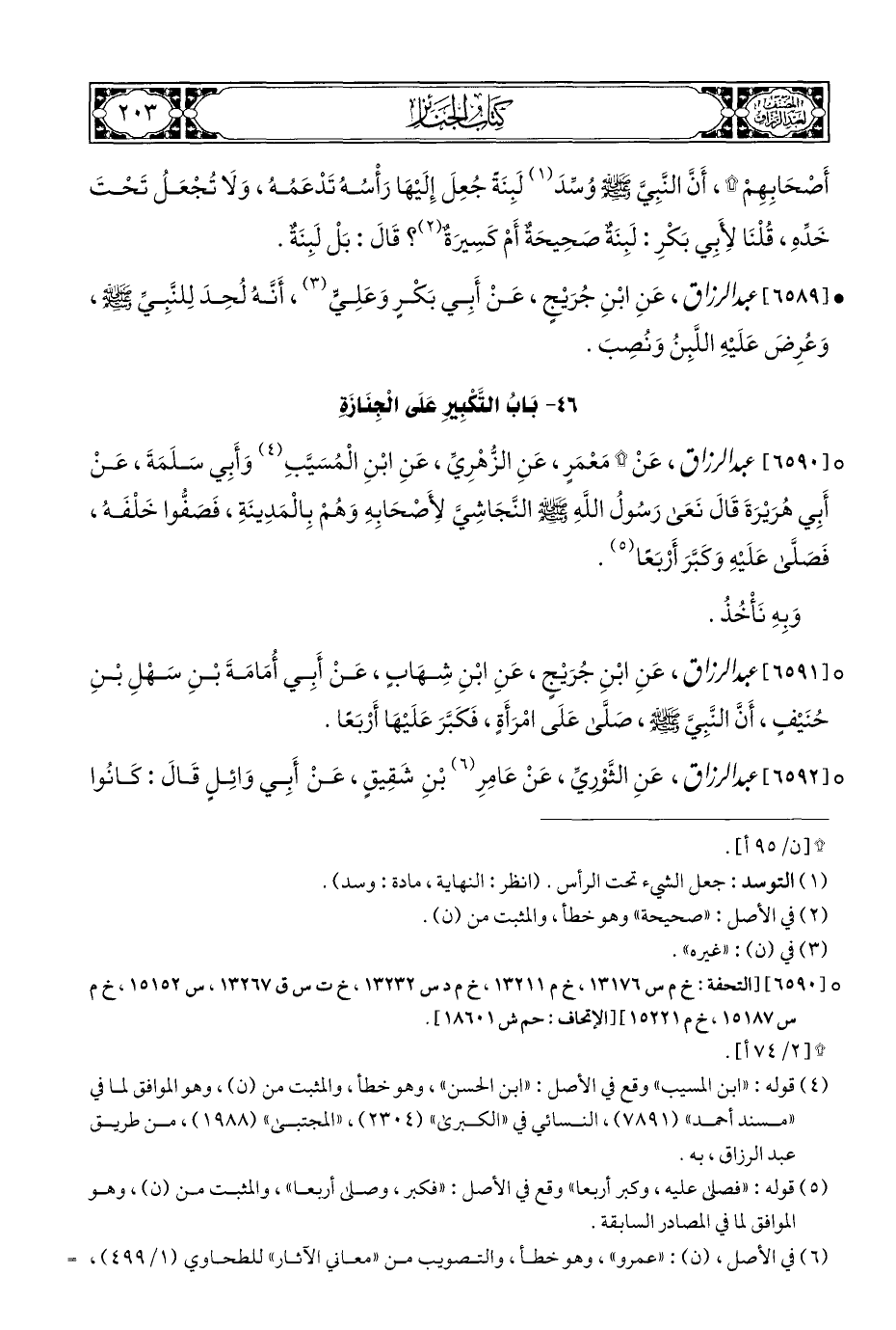 ° [٦٥٩١] عبد الرزاق، عَنِ ابْنِ جُرَيْجٍ، عَنِ ابْنِ شِهَابٍ، عَنْ أَبِي أُمَامَةَ بْنِ سَهْلِ بْنِ حُنَيْفٍ، أَنَّ النَّبِيَّ - صلى الله عليه وسلم -، صلَّى عَلَى امْرَأَةٍ، فَكَبَّرَ عَلَيْهَا أَرْبَعًا.