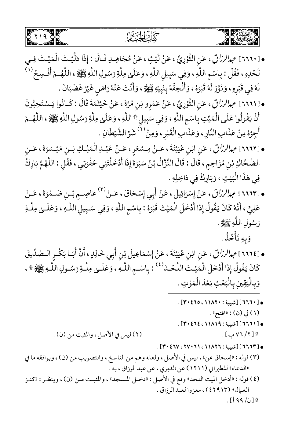 • [٦٦٦١] عبد الرزاق، عَنِ الثَّوْرِيِّ، عَنْ عَمْرِو بْنِ مُرَّةَ، عَنْ خَيْثَمَةَ قَالَ: كَانُوا يَسْتَحِبُّونَ أَنْ يَقُولُوا عَلَى الْمَيِّتِ بِاسْمِ اللَّهِ، وَفِي سَبِيلِ * اللَّهِ، وَعَلَى مِلَّةِ رَسُولِ اللَّهِ - صلى الله عليه وسلم -، اللَّهُمَّ أَجِرْهُ مِنْ عَذَابِ النَّارِ، وَعَذَابِ الْقَبْرِ، وَمِنْ (¬٢) شَرِّ الشَّيْطَانِ.