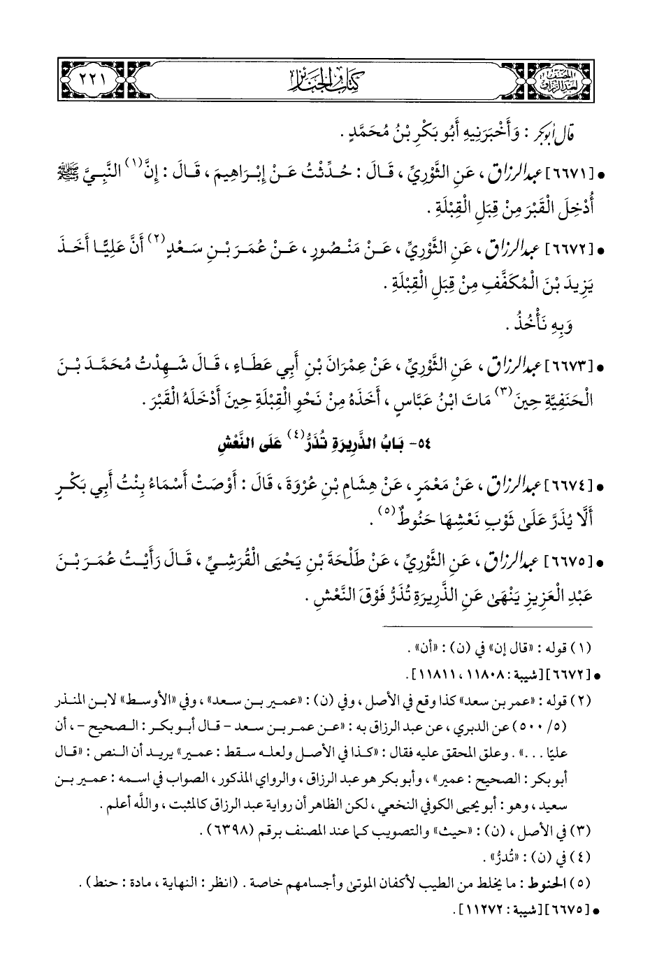 • [٦٦٧٤] عبد الرزاق، عَنْ مَعْمَرٍ، عَنْ هِشَامِ بْنِ عُرْوَةَ، قَالَ: أَوْصَتْ أَسْمَاءُ بِنْتُ أَبِي بَكْرٍ أَلَّا يُذَرَّ عَلَى ثَوْبِ نَعْشِهَا حَنُوطٌ (¬٥).