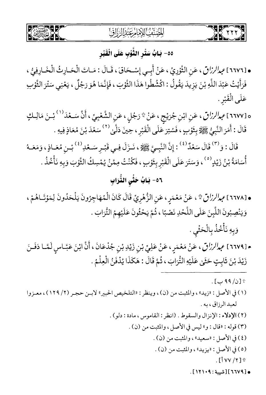 ° [٦٦٧٧] عبد الرزاق، عَنِ ابْنِ جُرَيْجٍ، عَنْ * رَجُلٍ، عَنِ الشَّعْبِيِّ، أَنَّ سَعْدَ (¬١) بْنَ مَالِكٍ قَالَ: أَمَرَ النَّبِيُّ - صلى الله عليه وسلم - بِثَوْبٍ، فَسُتِرَ عَلَى الْقَبْرِ، حِينَ دَلَّى (¬٢) سَعْدَ بْنَ مُعَاذٍ فِيهِ. قَالَ: وَ (¬٣) قَالَ سَعْدٌ (¬٤): إِنَّ النَّبِيَّ - صلى الله عليه وسلم -، نَزَلَ فِي قَبْرِ سَعْدِ (¬٤) بْنِ مُعَاذٍ، وَمَعَهُ أُسَامَةُ بْنُ زَيْدٍ (¬٥)، وَسَتَرَ عَلَى الْقَبْرِ بِثَوْبٍ، فَكُنْتُ مِمَّنْ يُمْسِكُ الثَّوْبَ وَبِهِ نَأْخُذُ.