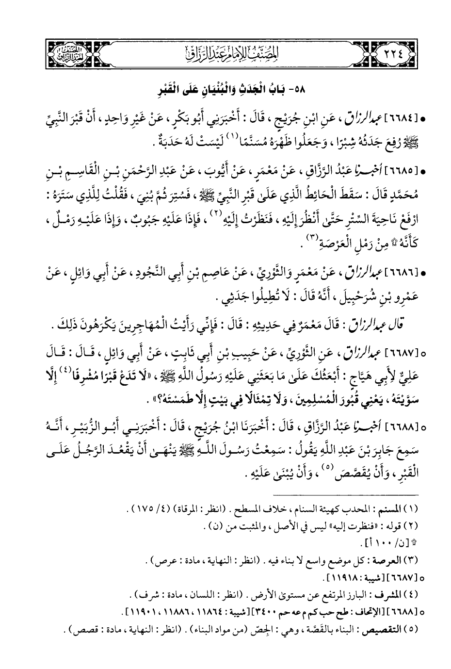 • [٦٦٨٥] أخبرنا عَبْدُ الرَّزَّاقِ، عَنْ مَعْمَرٍ، عَنْ أَيُّوبَ، عَنْ عَبْدِ الرَّحْمَنِ بْنِ الْقَاسِمِ بْنِ مُحَمَّدٍ قَالَ: سَقَطَ الْحَائِطُ الَّذِي عَلَى قَبْرِ النَّبِيِّ - صلى الله عليه وسلم -، فَسُتِرَ ثُمَّ بُنِيَ، فَقُلْتُ لِلَّذِي سَتَرهُ: ارْفَعْ نَاحِيَةَ السِّتْرِ حَتَّى أَنْظُرَ إِلَيْهِ، فَنَظَرْتُ إِلَيْهِ (¬٢)، فَإِذَا عَلَيْهِ جَبُوبٌ، وإِذَا عَلَيْهِ رَمْلٌ، كَأَنَّهُ * مِنْ رَمْلِ الْعَرْصَةِ (¬٣).