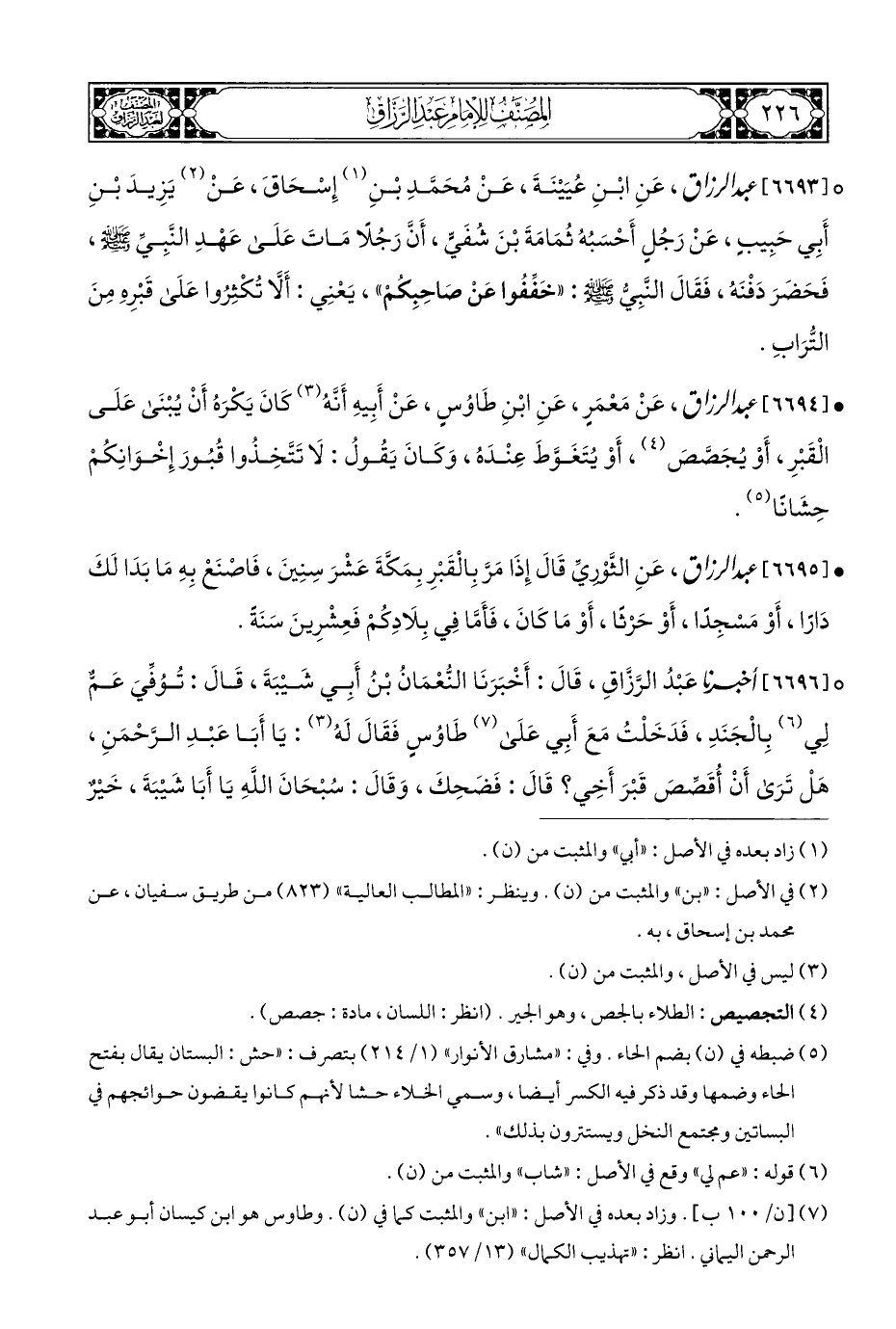 • [٦٦٩٤] عبد الرزاق، عَنْ مَعْمَر، عَنِ ابْنِ طَاوُسٍ، عَنْ أَبِيهِ أَنَّهُ (¬٣) كَانَ يَكْرَهُ أَنْ يُبْنَى عَلَى الْقَبْرِ، أَوْ يُجَصَّصَ (¬٤)، أَوْ يُتَغَوَّطَ عِنْدَهُ، وَكَانَ يَقُولُ: لَا تَتَّخِذُوا قُبُورَ إِخْوَانِكُمْ حِشَانًا (¬٥).