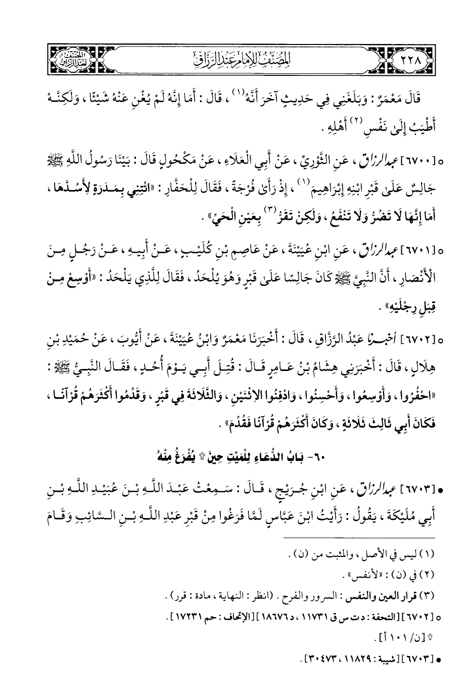 ° [٦٧٠١] عبد الرزاق، عَنِ ابْنِ عُيَيْنَةَ، عَنْ عَاصِمِ بْنِ كُلَيْبٍ، عَنْ أَبِيهِ، عَنْ رَجُلٍ مِنَ الْأَنْصَارِ، أَنَّ النبِيَّ - صلى الله عليه وسلم - كَانَ جَالِسًا عَلَى قَبْرٍ وَهُوَ يُلْحَدُ، فَقَالَ لِلَّذِي يَلْحَدُ: "أَوْسِعْ مِنْ قِبَلِ رِجْلَيْهِ".