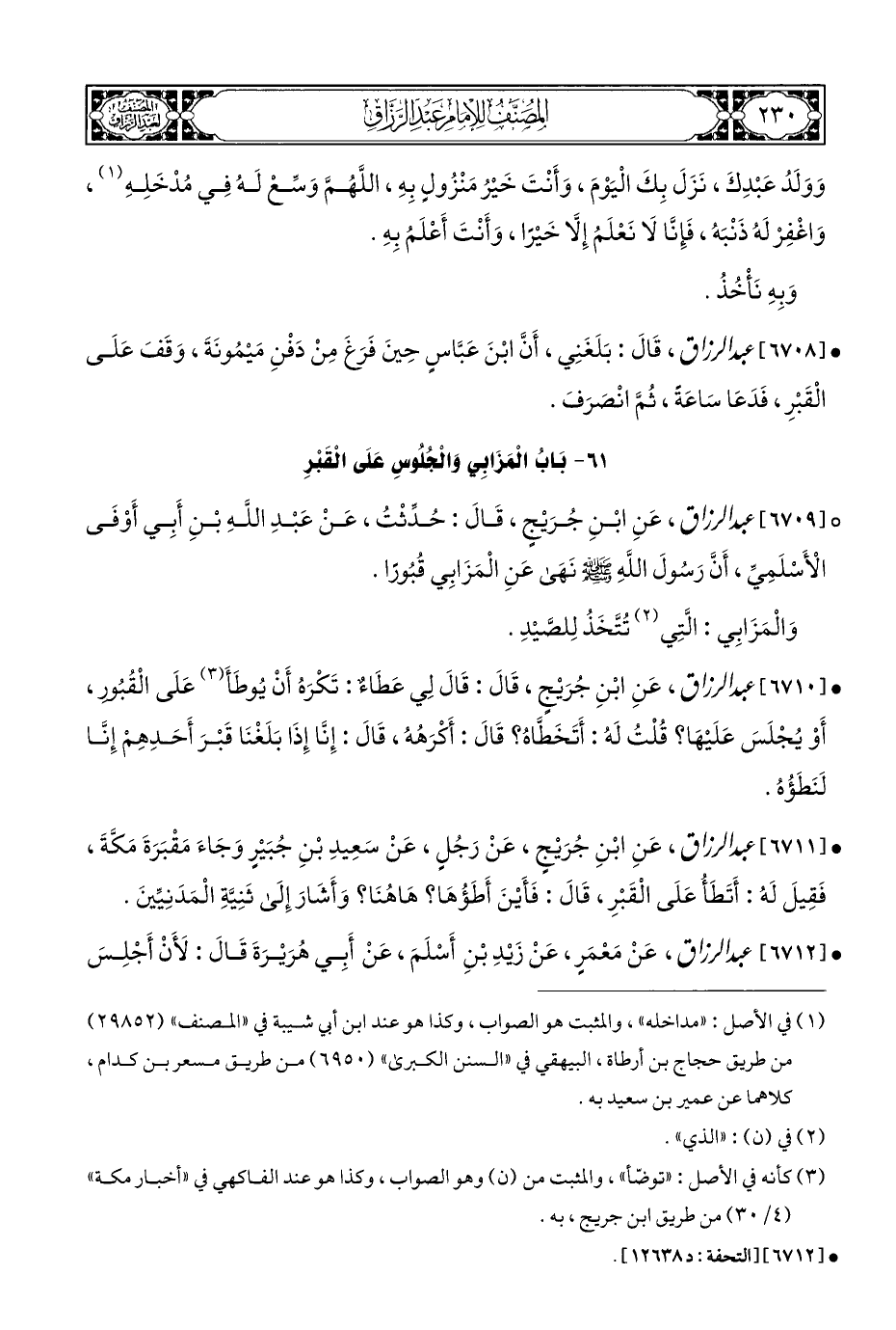 ° [٦٧٠٩] عبد الرزاق، عَنِ ابْنِ جُرَيْجٍ، قَالَ: حُدِّثْتُ، عَنْ عَبْدِ اللَّهِ بْنِ أَبِي أَوْفَى الْأَسْلَمِيِّ، أَنَّ رَسُولَ اللَّهِ - صلى الله عليه وسلم - نَهَى عَنِ الْمَزَابِي قُبُورًا.