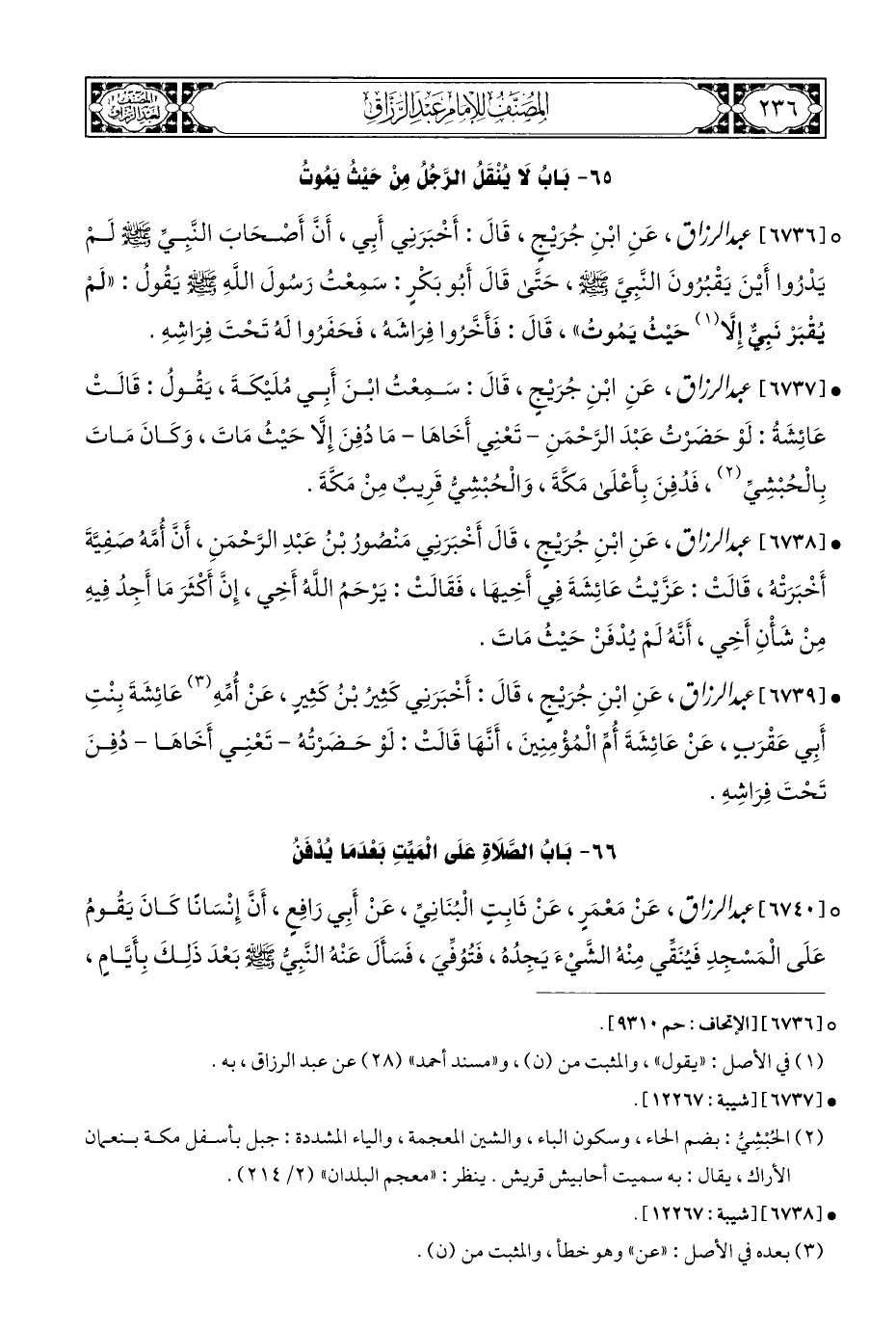 • [٦٧٣٧] عبد الرزاق، عَنِ ابْنِ جُرَيْجٍ، قَالَ: سَمِعْتُ ابنَ أَبِي مُلَيْكَةَ، يَقُولُ: قَالَتْ عَائِشَةُ: لَوْ حَضَرْتُ عَبْدَ الرَّحْمَنِ - تَعْنِي أَخَاهَا - مَا دُفِنَ إِلَّا حَيْثُ مَاتَ، وَكَانَ مَاتَ بِالْحُبْشِيِّ (¬٢)، فَدُفِنَ بِأَعْلَى مَكَّةَ، وَالْحُبْشِيُّ قَرِيبٌ مِنْ مَكَّةَ.