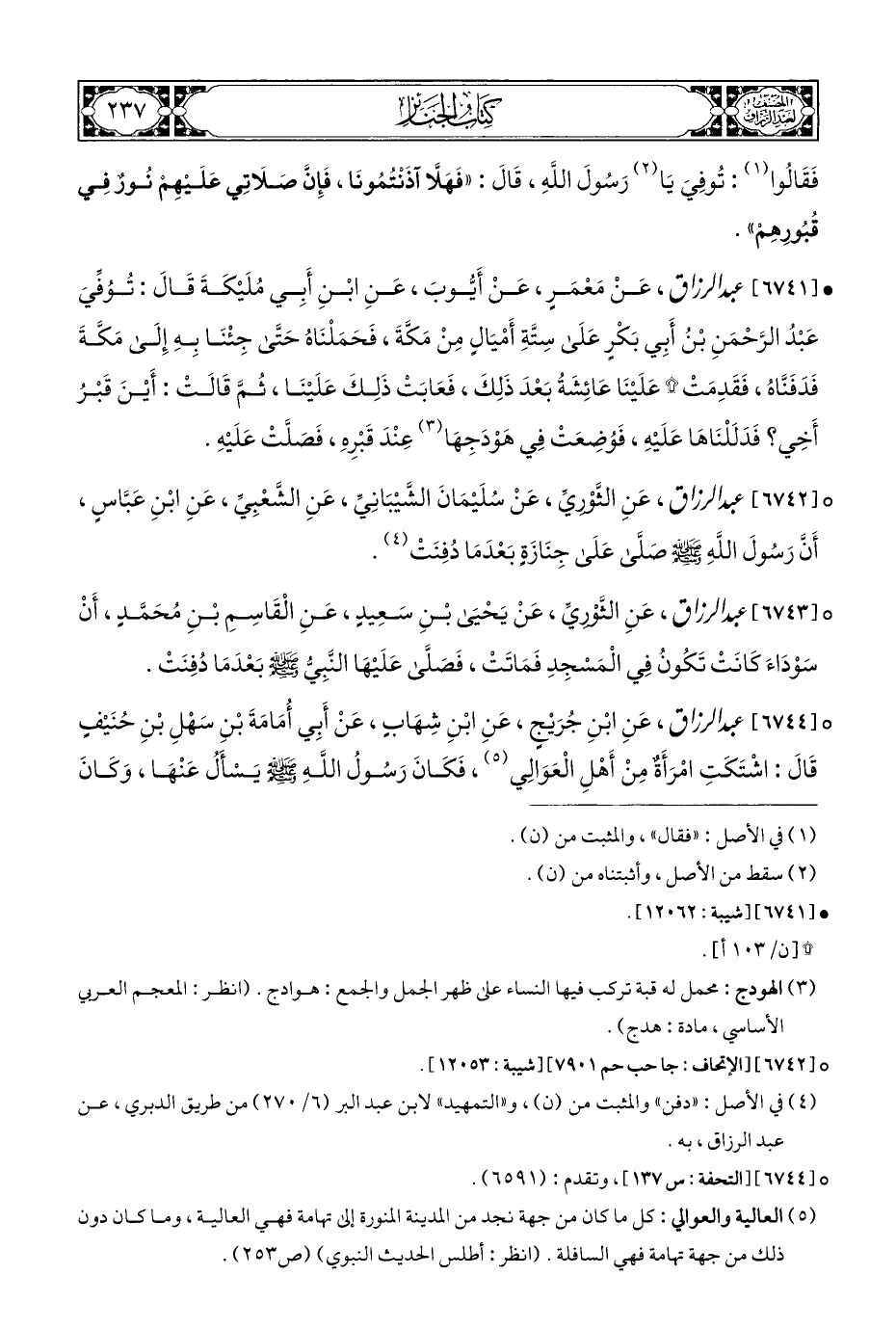 ° [٦٧٤٣] عبد الرزاق، عَنِ الثَّوْرِيِّ، عَنْ يَحْيَى بْنِ سَعِيدٍ، عَنِ الْقَاسِمِ بْنِ مُحَمَّدٍ، أَنْ سَوْدَاءَ كَانَتْ تَكُونُ فِي الْمَسْجِدِ فَمَاتَتْ، فَصلَّى عَلَيْهَا النَّبِيُّ - صلى الله عليه وسلم - بَعْدَمَا دُفِنَتْ.