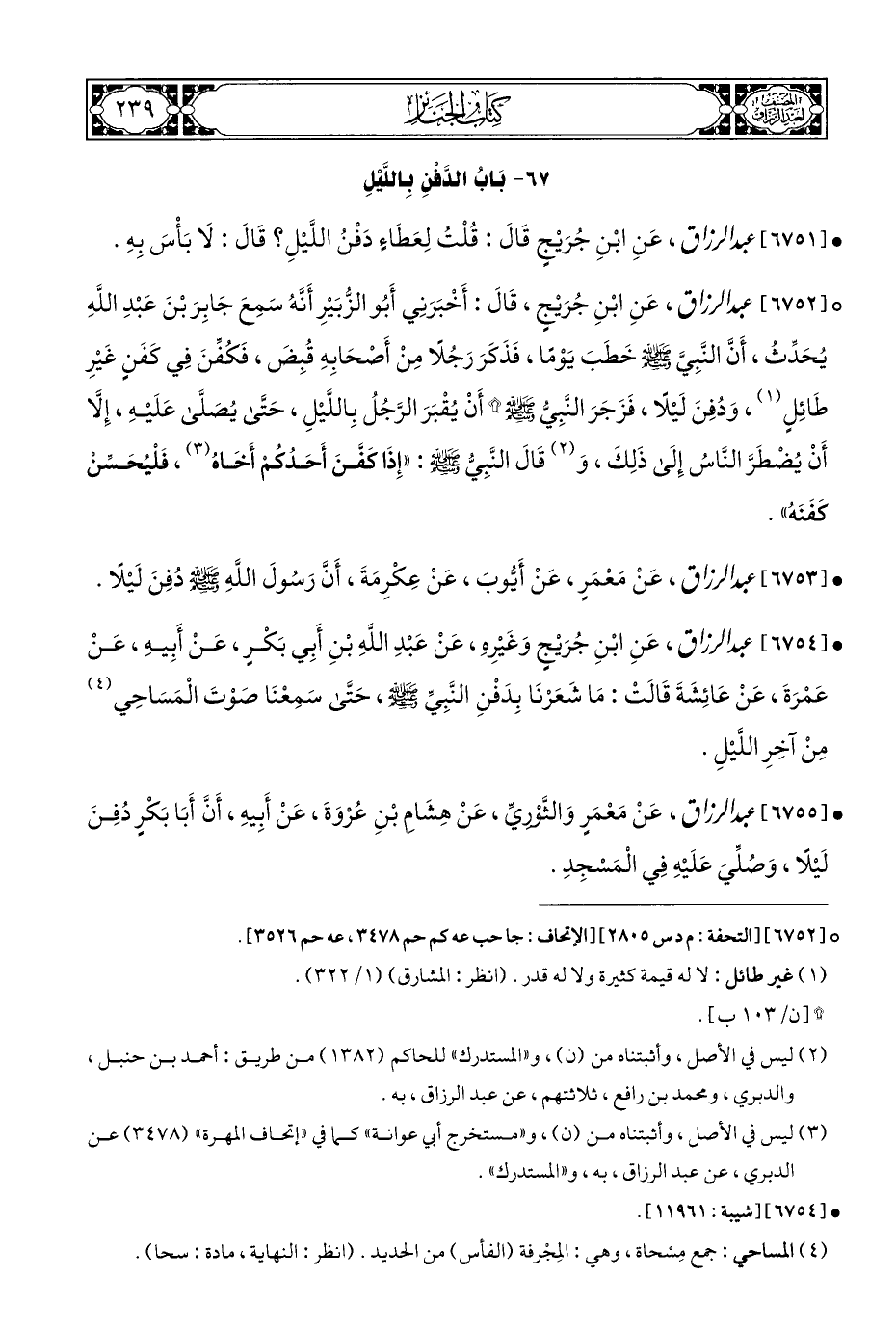 ° [٦٧٥٢] عبد الرزاق، عَنِ ابْنِ جُرَيْجٍ، قَالَ: أَخْبَرَنِي أَبُو الزُّبَيْرِ أَنَّهُ سَمِعَ جَابِرَ بْنَ عَبْدِ اللَّهِ يُحَدِّثُ، أَنَّ النَّبِيَّ - صلى الله عليه وسلم - خَطَبَ يَوْمًا، فَذَكَرَ رَجُلًا مِنْ أَصْحَابِهِ قُبِضَ، فَكُفِّنَ فِي كَفَنٍ غَيْرِ طَائِلٍ (¬١)، وَدُفِنَ لَيْلًا، فَزَجَرَ النَّبِيُّ - صلى الله عليه وسلم - * أَنْ يُقْبَرَ الرَّجُلُ بِاللَّيْلِ، حَتَّى يُصَلَّى عَلَيْهِ، إِلَّا أَنْ يُضْطَرَّ النَّاسُ إِلَى ذَلِكَ، وَ (¬٢) قَالَ النَّبِيُّ - صلى الله عليه وسلم -: "إِذَا كَفَّنَ أَحَدُكُمْ أَخَاهُ (¬٣)، فَلْيُحَسِّنْ كَفَنَهُ".