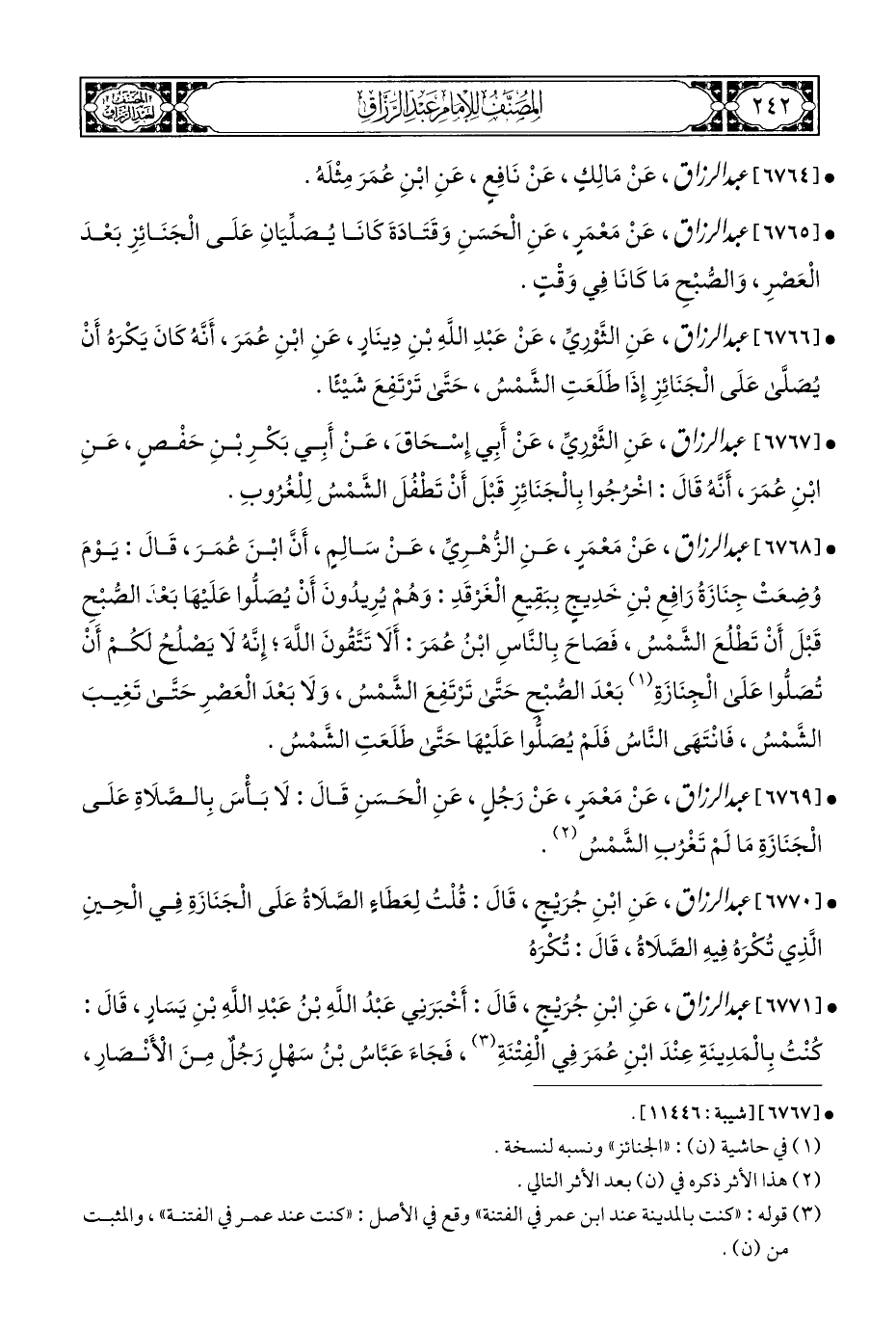 • [٦٧٦٨] عبد الرزاق، عَنْ مَعْمَرٍ، عَنِ الزُّهْرِيِّ، عَنْ سَالِمٍ، أَنَّ ابْنَ عُمَرَ، قَالَ: يَوْمَ وُضِعَتْ جِنَازَةُ رَافِعِ بْنِ خَدِيجٍ بِبَقِيعِ الْغَرْقَدِ: وَهُمْ يُرِيدُونَ أَنْ يُصَلُّوا عَلَيْهَا بَعدَ الصُّبْحِ قَبْلَ أَنْ تَطْلُعَ الشَّمْسُ، فَصَاحَ بِالنَّاسِ ابْنُ عُمَرَ: أَلَا تَتَّقُونَ اللَّهَ؛ إِنَّهُ لَا يَصْلُحُ لَكُمْ أَنْ تُصَلُّوا عَلَى الْجِنَازَةِ (¬١) بَعْدَ الصُّبْح حَتَّى تَرْتَفِعَ الشَّمْسُ، وَلَا بَعْدَ الْعَصْرِ حَتَّى تَغِيبَ الشَّمْسُ، فَانْتَهَى النَّاسُ فَلَمْ يُصَلُّوا عَلَيْهَا حَتَّى طَلَعَتِ الشَّمْسُ.