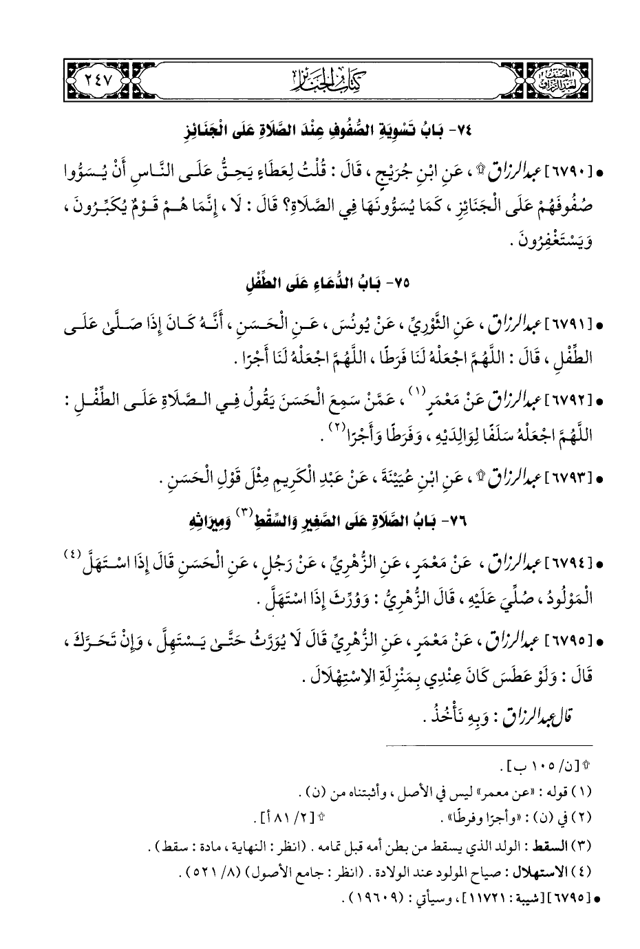 • [٦٧٩٢] عبد الرزاق عَنْ مَعْمَرٍ (¬١)، عَمَّنْ سَمِعَ الْحَسَنَ يَقُولُ فِي الصَّلَاةِ عَلَى الطِّفْلِ: اللَّهُمَّ اجْعَلْهُ سَلَفًا لِوَالِدَيْهِ، وَفَرَطًا وَأَجْرًا (¬٢).
