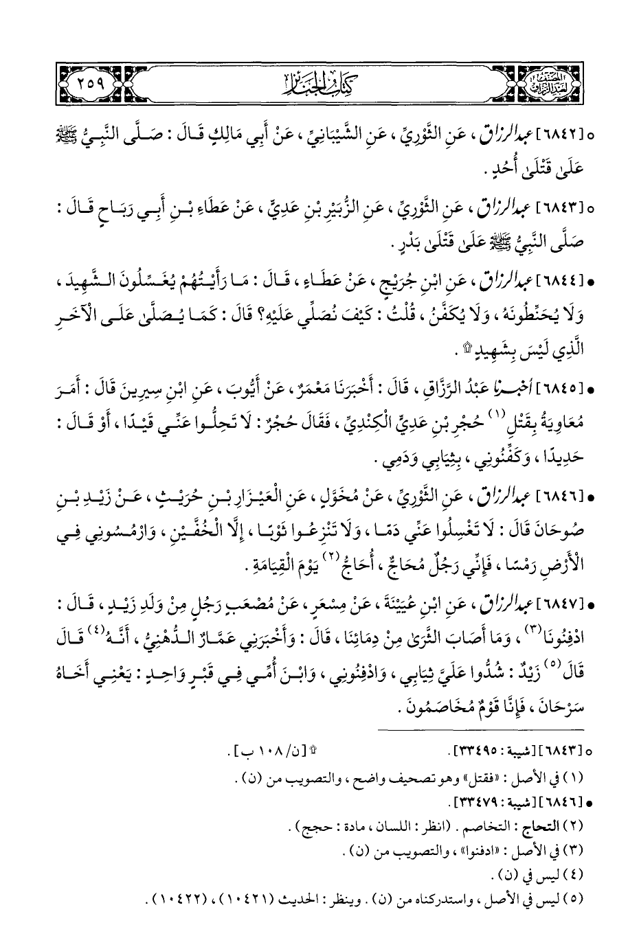 ° [٦٨٤٢] عبد الرزاق، عَنِ الثَّوْريِّ، عَنِ الشَّيْبَانِيِّ، عَنْ أَبِي مَالِكٍ قَالَ: صَلَّى النَّبِيُّ - صلى الله عليه وسلم - عَلَى قَتْلَى أُحُدٍ.