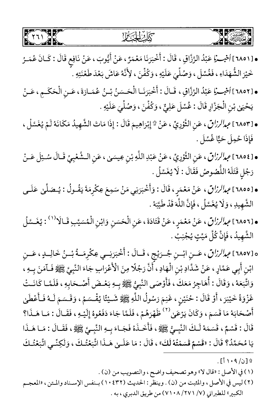 • [٦٨٥٦] عبد الرزاق، عَنْ مَعْمَرٍ، عَنْ قَتَادَةَ، عَنِ الْحَسَنِ وَابْنِ الْمُسَيَّبِ قَالَا (¬١): يُغَسَّلُ الشَّهِيدُ، فَإِنَّ كُلَّ مَيِّتٍ يُجْنِبُ.