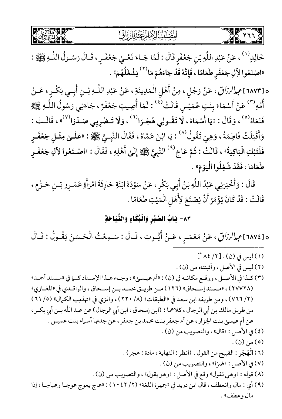° [٦٨٧٣] عبد الرزاق، عَنْ رَجُلٍ، مِنْ أَهْلِ الْمَدِينَةِ، عَنْ عَبْدِ اللَّهِ بْنِ أَبِي بَكْرٍ، عَنْ أُمِّهِ (¬٣) عَنْ أَسْمَاءَ بِنْتِ عُمَيْسٍ قَالَتْ (¬٤): لَمَّا أُصِيبَ جَعْفَرٌ، جَاءَنِي رَسُولُ اللَّهِ - صلى الله عليه وسلم - فَنَعَاهُ (¬٥)، وَقَالَ: "يَا أَسْمَاءُ، لا تَقُولِي هُجْرًا (¬٦)، وَلَا تَضْرِبِي صَدْرًا (¬٧) "، قَالَتْ: وَأَقْبَلَتْ فَاطِمَةُ، وَهِيَ تَقُولُ (¬٨): يَا ابْنَ عَمَّاهُ، فَقَالَ النَّبِيُّ - صلى الله عليه وسلم -: "عَلَى مِثْلِ جَعْفَرٍ فَلْتَبْكِ الْبَاكِيَةُ"، قَالَتْ: ثُمَّ عَاجَ (¬٩) النَّبِيُّ - صلى الله عليه وسلم - إِلَى أَهْلِهِ، فَقَالَ: "اصْنَعُوا لآِلِ جَعفَرٍ طَعَامًا، ققَدْ شُغِلُوا الْيَوْمَ".