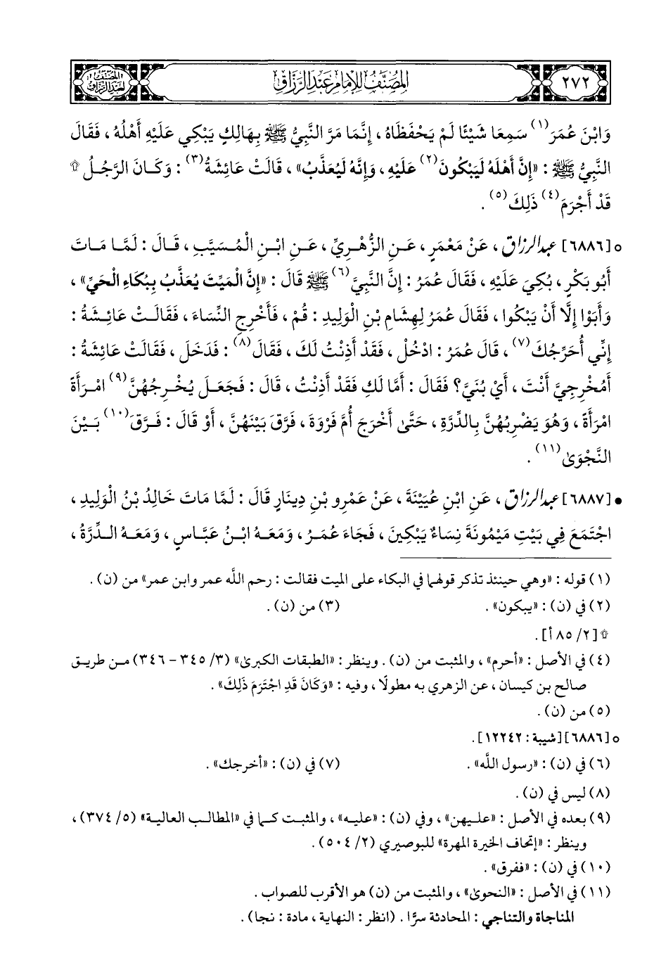 ° [٦٨٨٦] عبد الرزاق، عَنْ مَعْمَرٍ، عَنِ الزُّهْرِيِّ، عَنِ ابْنِ الْمُسَيَّبِ، قَالَ: لَمَّا مَاتَ أَبُو بَكْرٍ، بُكِيَ عَلَيْهِ، فَقَالَ عُمَرُ: إِنَّ النَّبِيَّ (¬٦) - صلى الله عليه وسلم - قَالَ: "إِنَّ الْمَيِّتَ يُعَذَّبُ بِبُكَاءِ الْحَيِّ"، وَأَبَوْا إِلَّا أَنْ يَبْكُوا، فَقَالَ عُمَرُ لِهِشَامِ بْنِ الْوَلِيدِ: قُمْ، فَأَخْرِجِ النِّسَاءَ، فَقَالَتْ عَائِشَةُ: إِنِّي أُحَرِّجُكَ (¬٧)، قَالَ عُمَرُ: ادْخُلْ، فَقَدْ أَذِنْتُ لَكَ، فَقَالَ (¬٨): فَدَخَلَ، فَقَالَتْ عَائِشَةُ: أَمُخْرِجِيَّ أَنْتَ، أَيْ بُنَيَّ؟ فَقَالَ: أَمَّا لَكِ فَقَدْ أَذِنْتُ، قَالَ: فَجَعَلَ يُخْرِجُهُنَّ (¬٩) امْرَأَةً امْرَأَةً، وَهُوَ يَضْرِبُهُنَّ بِالدِّرَّةِ، حَتَّى أَخرَجَ أُمَّ فَرْوَةَ، فَرَّقَ بَيْنَهُنَّ، أَوْ قَالَ: فَرَّقَ (¬١٠) بَيْنَ النَّجْوَى (¬١١).