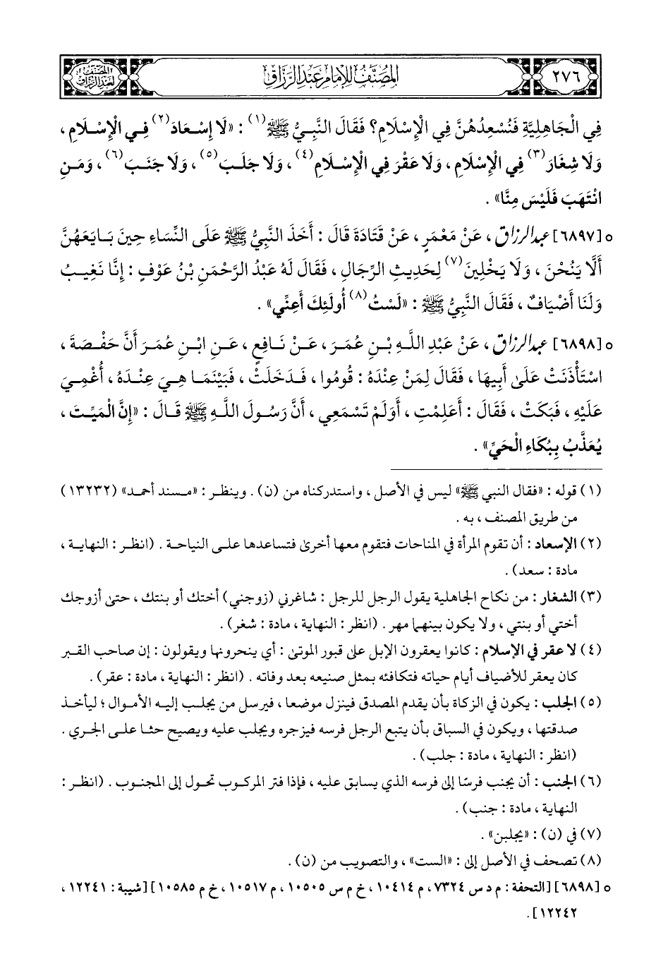 ° [٦٨٩٧] عبد الرزاق، عَنْ مَعْمَرٍ، عَنْ قَتَادَةَ قَالَ: أَخَذَ النَّبِيُّ - صلى الله عليه وسلم - عَلَى النِّسَاءِ حِينَ بَايَعَهُنَّ أَلَّا يَنُحْنَ، وَلَا يَخْلِينَ (¬٧) لِحَدِيثِ الرِّجَالِ، فَقَالَ لَهُ عَبْدُ الرَّحْمَنِ بْنُ عَوْفٍ: إِنَّا نَغِيبُ وَلَنَا أَضْيَافٌ، فَقَالَ النَّبِيُّ - صلى الله عليه وسلم -: "لَسْتُ (¬٨) أُولَئِكَ أَعِنِّي".