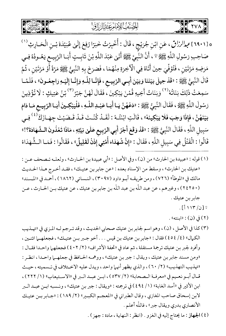 ° [٦٩٠١] عبد الرزاق، عَنِ ابْنِ جُرَيْجٍ، قَالَ: أُخْبِرْتُ خَبَرًا رُفِعَ إِلَى عُبَيْدَةَ بْنِ الْحَارِثِ (¬١) صَاحِبِ رَسُولِ اللَّهِ - صلى الله عليه وسلم - *، أَنَّ النَّبِيَّ - صلى الله عليه وسلم - أَتَى عَبْدَ اللَّهِ بْنَ ثَابِتٍ أَبَا الرَّبِيعِ يَعُودُهُ فِي مَرَضِهِ مَرَّتَيْنِ، فَتُوُفِّيَ حِينَ أَتَاهُ فِي الْآخِرَةِ مِنْهُمَا، فَصَرَخَ بِهِ النَّبِيُّ - صلى الله عليه وسلم - مَرَّةً أَوْ مَرَّتَيْنِ، ثُمَّ قَالَ النَّبِيُّ - صلى الله عليه وسلم -: "قَدْ حِيلَ بَيْنَنَا وَبَيْنَ أَبِي الرَّبِيعِ، فَإِنَّا لِلَّهِ وَإِنَّا إِلَيْهِ رَاجِعُونَ"، فَلَمَّا سَمِعَتْ ذَلِكَ بَنَاتُهُ (¬٢) وَبَنَاتُ أَخِيهِ قُمْنَ يَبْكِينَ، فَقَالَ لَهُنَّ جَبْرُ (¬٣) بْنُ عَتِيكٍ: لَا تُؤْذِينَ رَسُولَ اللَّهِ - صلى الله عليه وسلم -، فَقَالَ النَّبِيُّ - صلى الله عليه وسلم -: "دَعْهُنَّ يَا أَبَا عَبْدِ اللَّهِ، فَلْيَبْكِينَ أَبَا الرَّبِيعِ مَا دَامَ بَيْنَهُنَّ، فَإِذَا وَجَبَ فَلَا يَبْكِينَهُ"، قَالَتِ ابْنَتُهُ: لَقَدْ كُنْتَ قَدْ قَضَيْتَ جِهَازَكَ (¬٤) فِي سَبِيلِ اللَّهِ، فَقَالَ النَّبِيُّ - صلى الله عليه وسلم -: "قَدْ وَقَعَ أَجْرُ أَبِي الرَّبِيعِ عَلَى نِيَّتِهِ، مَاذَا تَعُدُّونَ الشَّهَادَةَ؟! " قَالُوا: الْقَتْلُ فِي سَبِيلِ اللَّهِ، فَقَالَ: "إِنَّ شُهَدَاءَ أُمَّتِي إِذَنْ لَقَلِيلٌ"، فَقَالُوا: فَمَا الشُّهَدَاءُ